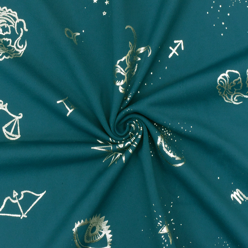 -Zodiac elements pattern foil printed on a tricot swimwear and yoga knit fabric from a famous yoga wear company