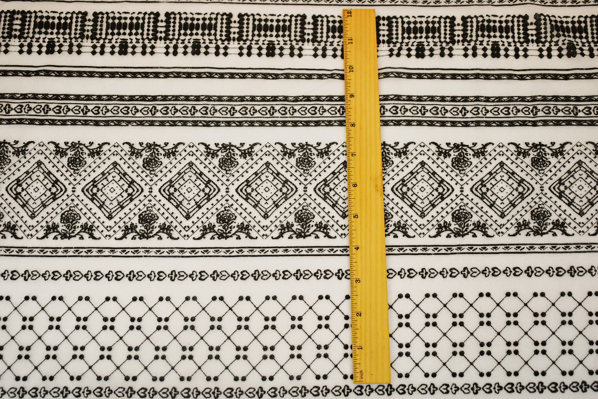 -100% Nylon tulle mesh fabric printed with a diamond multi pattern in a striped arrangement