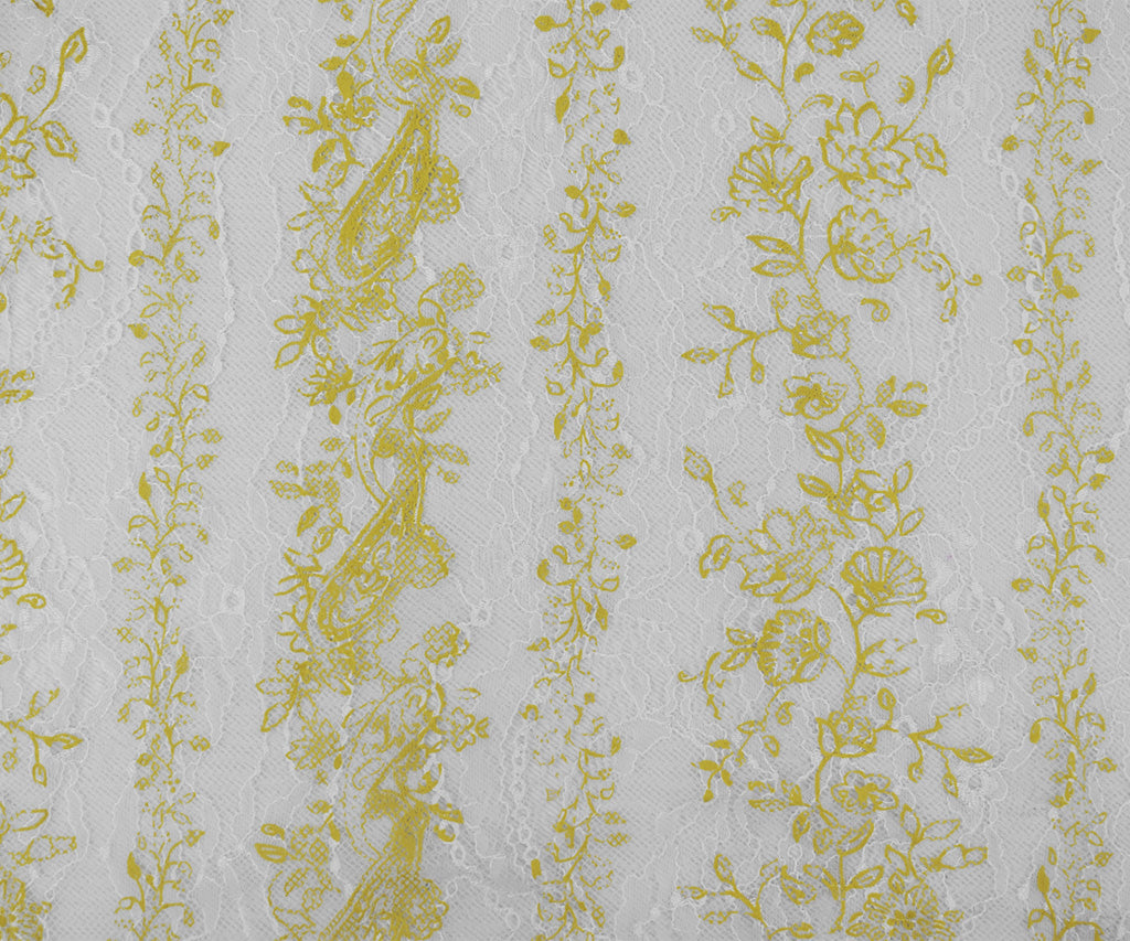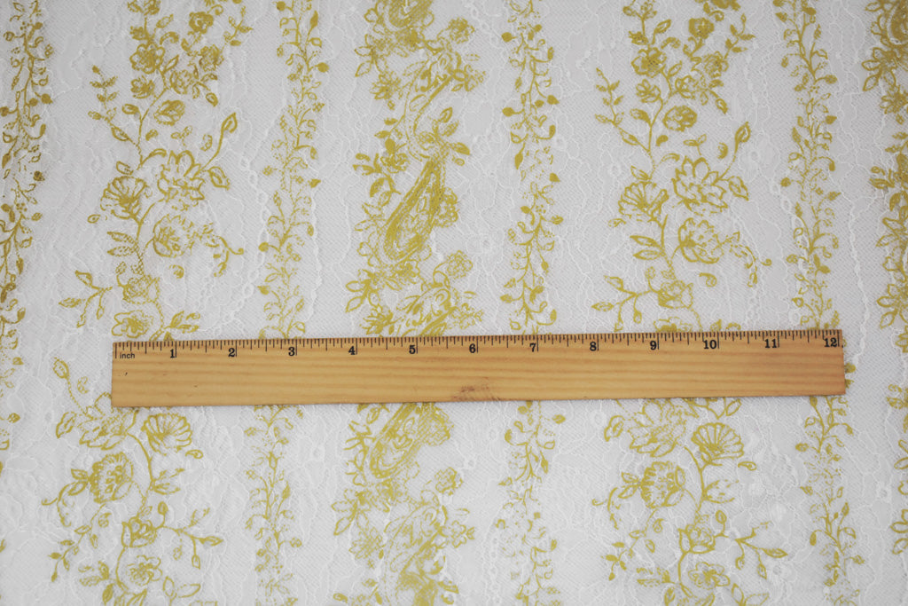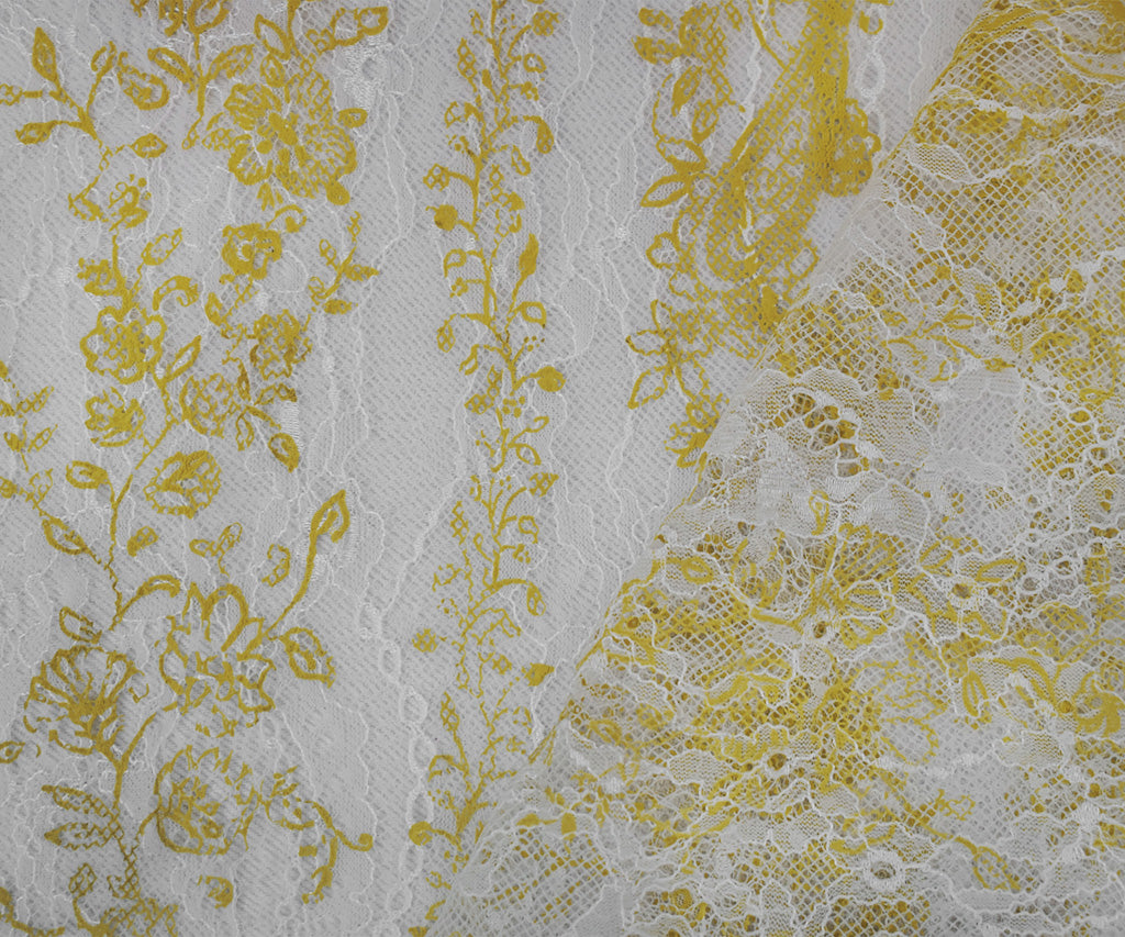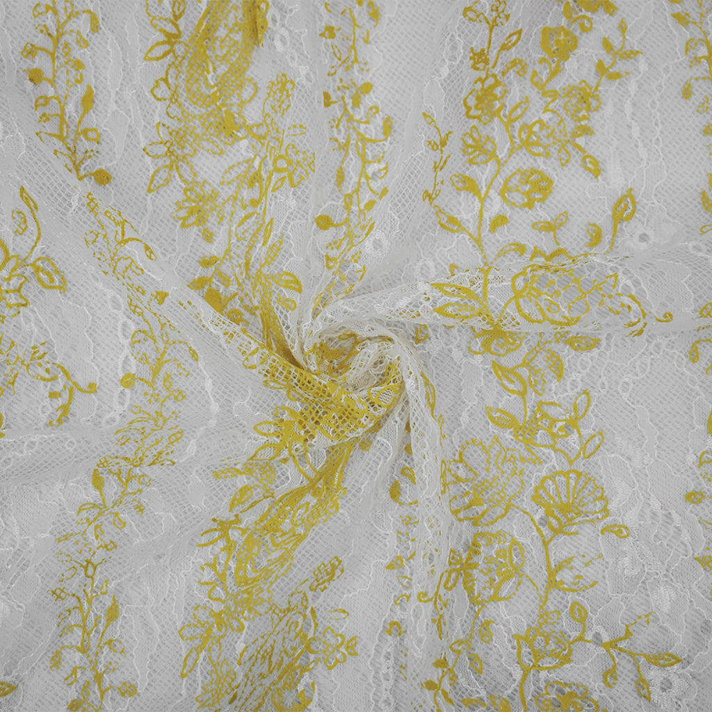 Yellow-White Nylon Floral Vine Printed Lace Mesh Knit Fabric