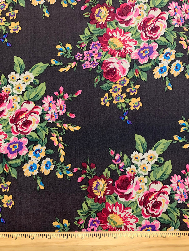 -Red, Pink, Cream, Yellow, Green, Purple, Blue, & Brown Multi Rose Floral Print Rayon Challis Fabric