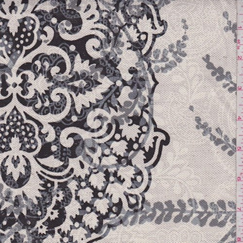 -100% linen canvas woven with a muted paisley print background in creamy white and a botanical and scroll print overlay in shades of pewter grey and black