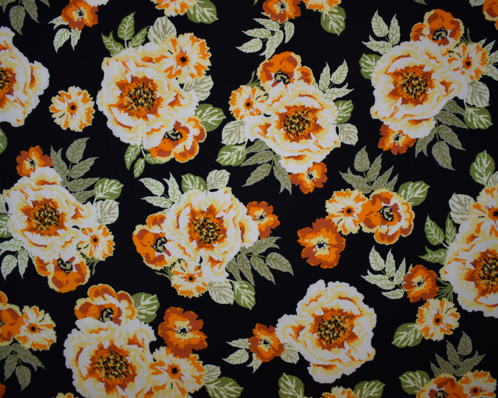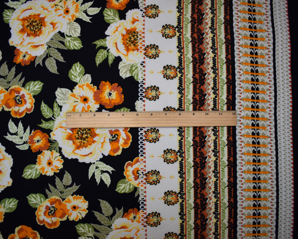 Black-Orange-Multi Poly Floral Stripe Geometry Border Print Pebble Crepe Woven Fabric