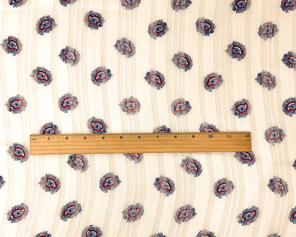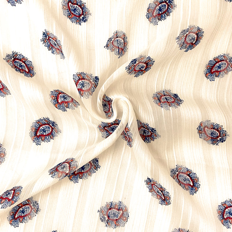 Ivory-Blue-Multi Poly Paisley Printed Satin Stripe Woven Fabric