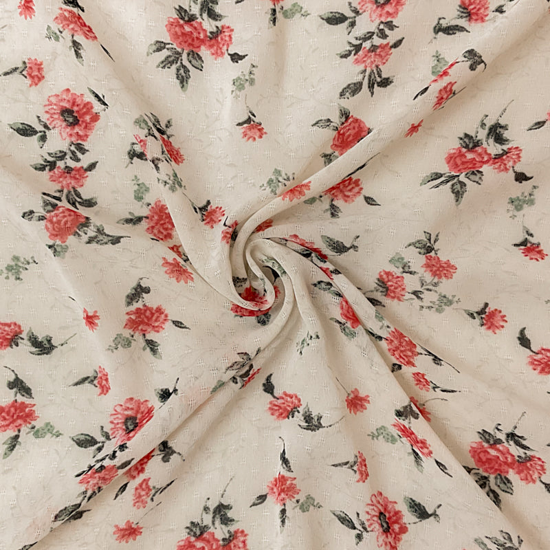Ivory-Green-Multi Poly Floral Printed Dobby Chiffon Woven Fabric