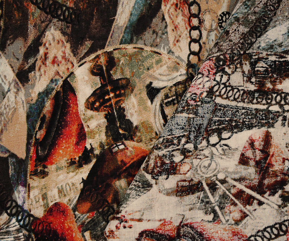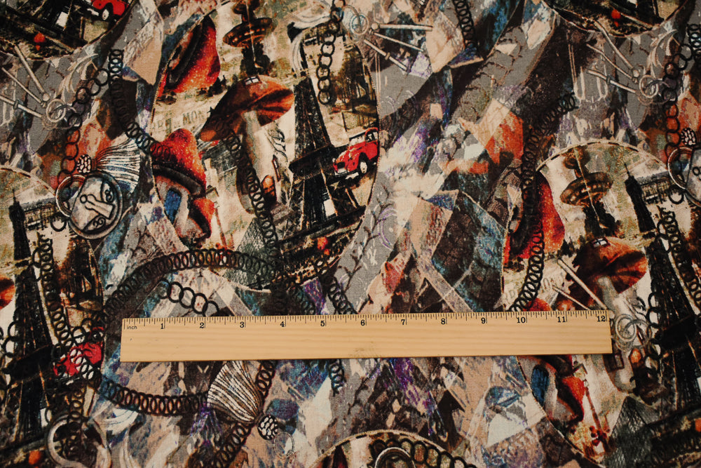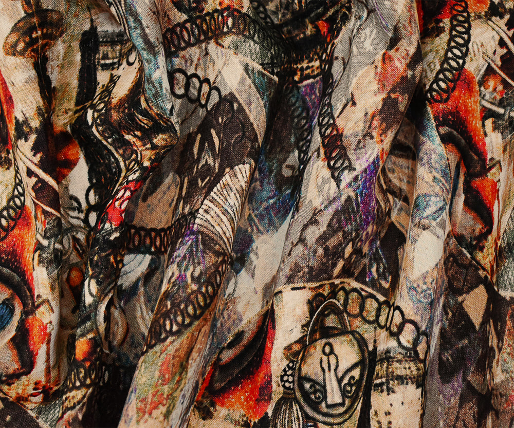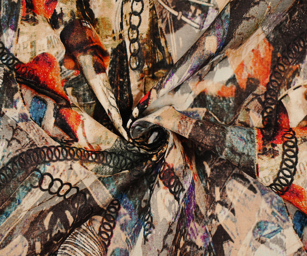 Brown-Beige-Multi Abstract Paris Vintage Time Printed Linen Woven Fabric