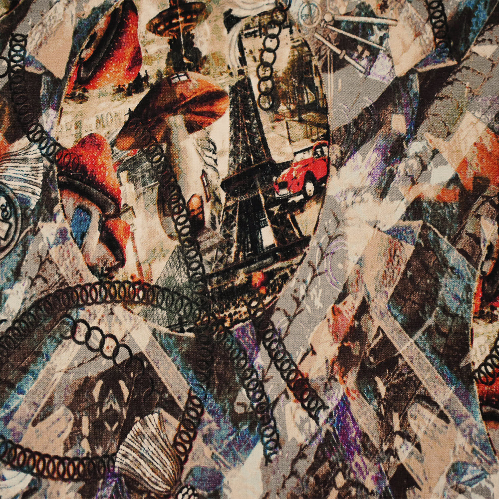 -100% linen plain woven fabric printed with an abstract vintage time paris theme pattern featuring the Eiffel tower, vintage car, coil pattern, tassles, vintage locks, and other vintage-like elements. Line if needed.