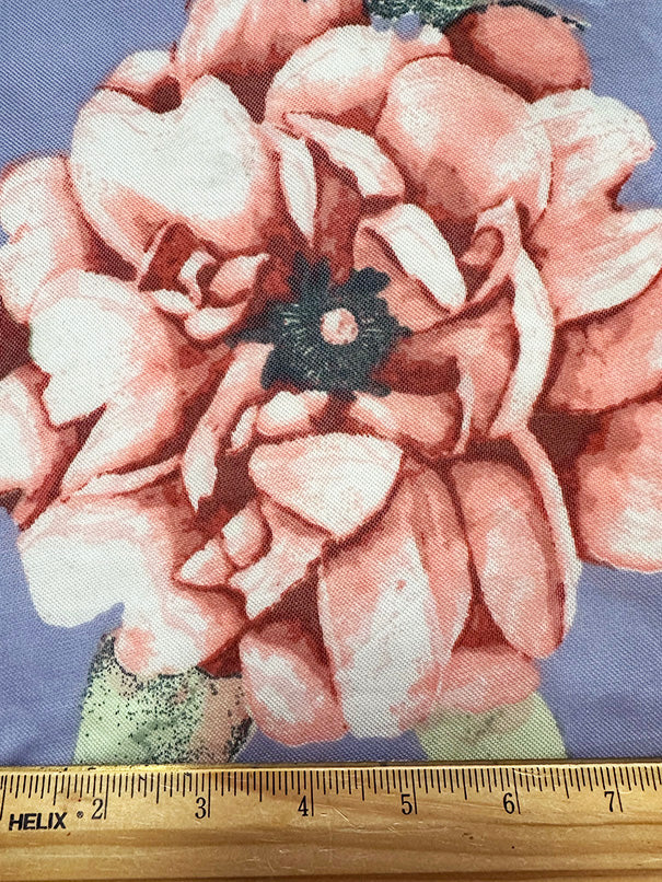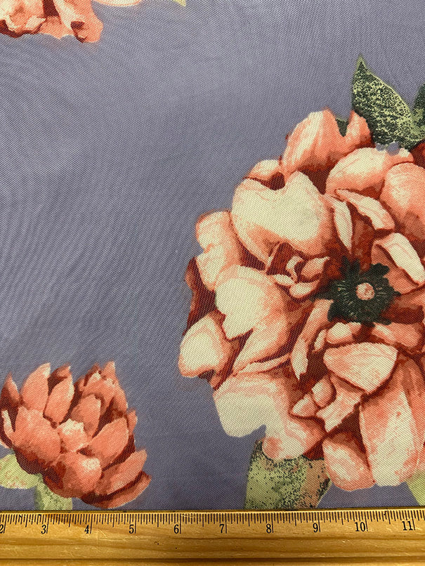 -Coral, Red, Ivory, Green, & Tan Multi Floral Print on Periwinkle Stretch Mesh Fabric
