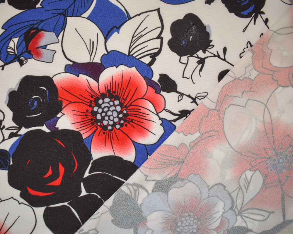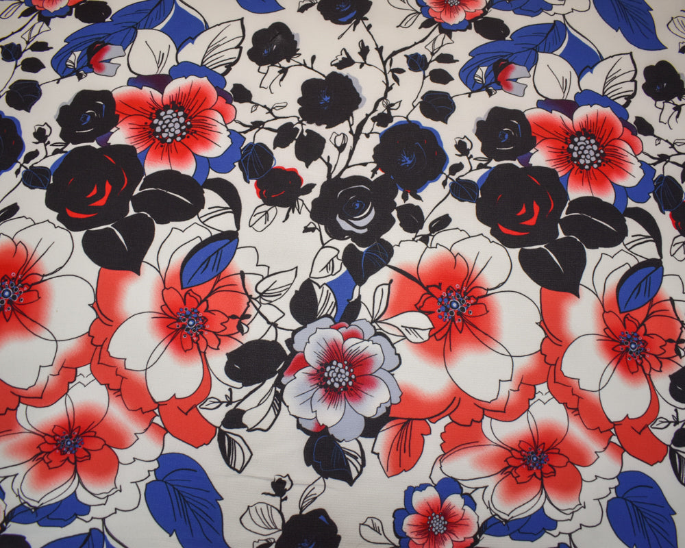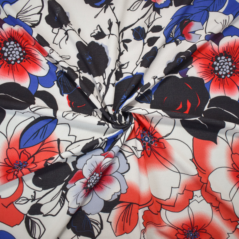 -Red-Blue-Multi Poly Floral Printed Pebble Crepe Woven Fabric