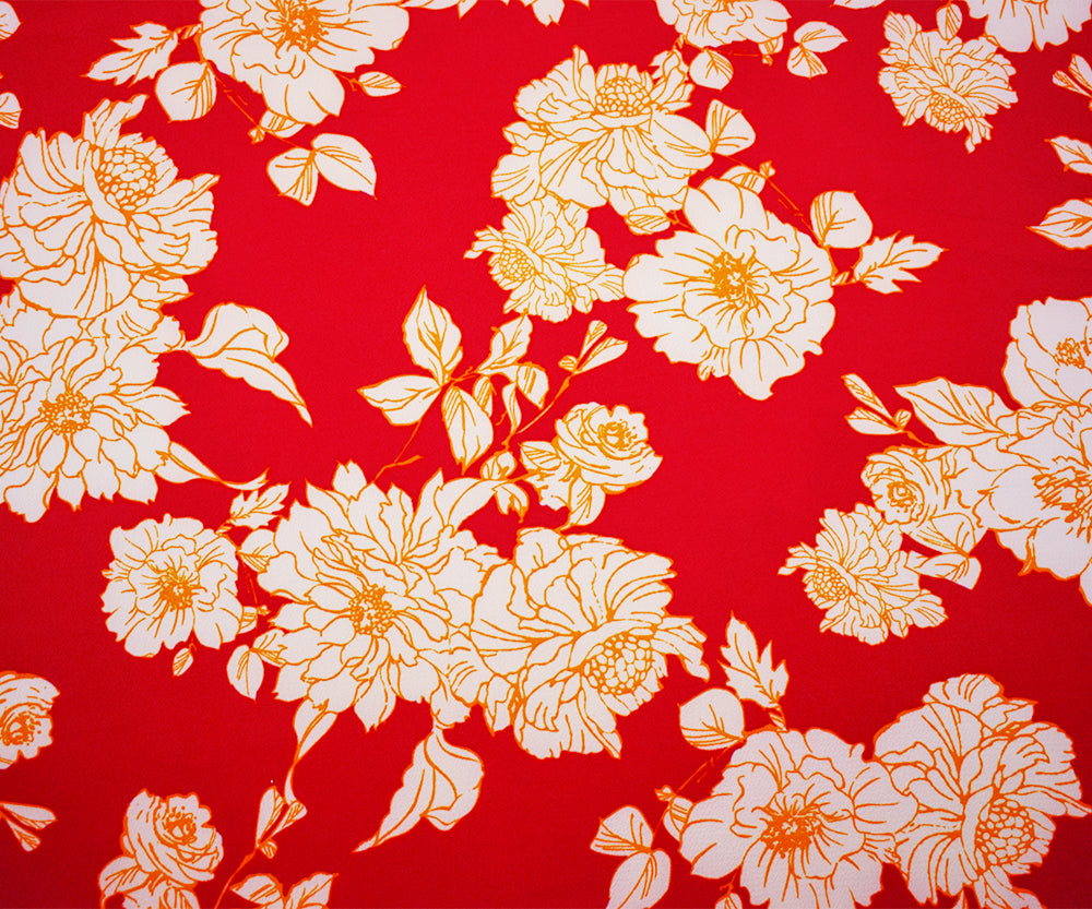 Red-Orange-White Poly Floral Printed Pebble Crepe Woven Fabric