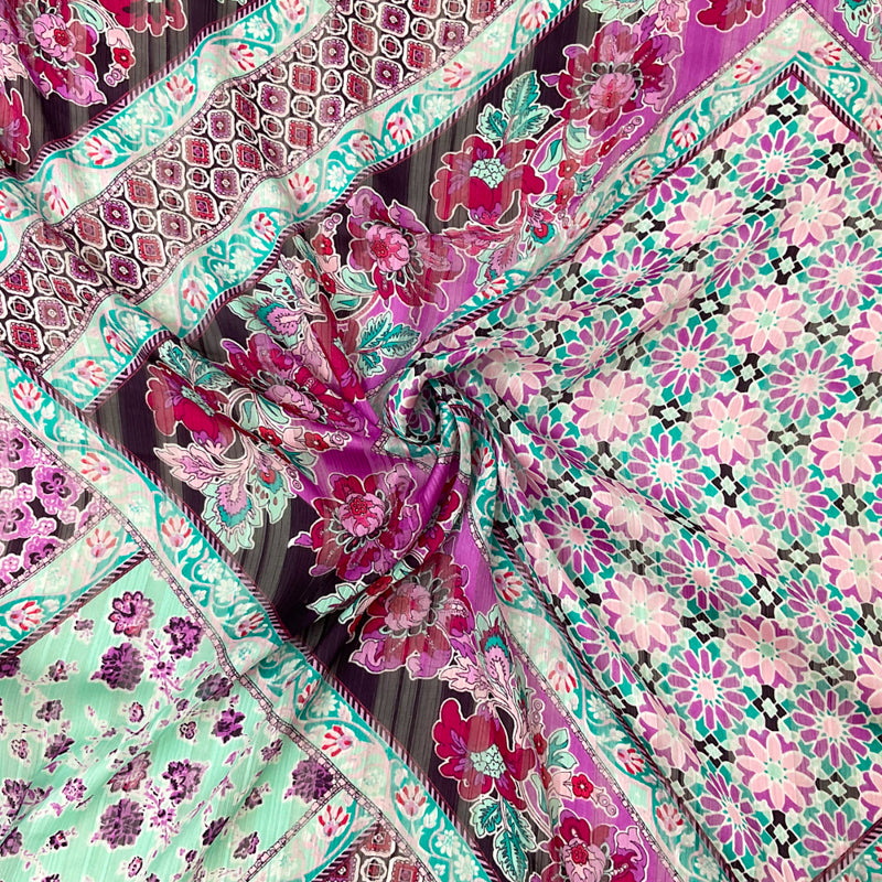 Turquoise-Multi Floral Printed Satin Stripe Chiffon Woven Fabric