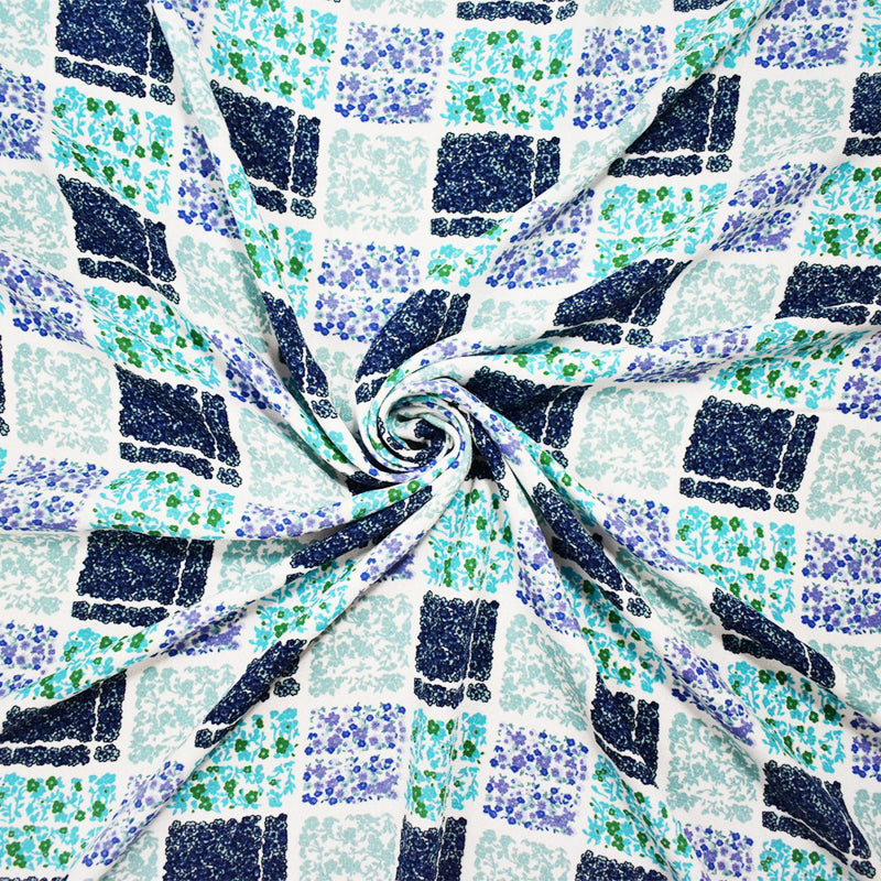 Turquoise Poly Check Floral Plaid Printed Moss Crepe Woven Fabric