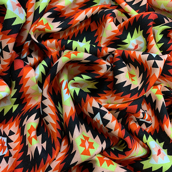 -Red, Pink, Yellow, White, Black Aztec Print Rayon Challis Fabric