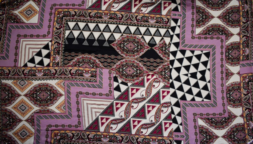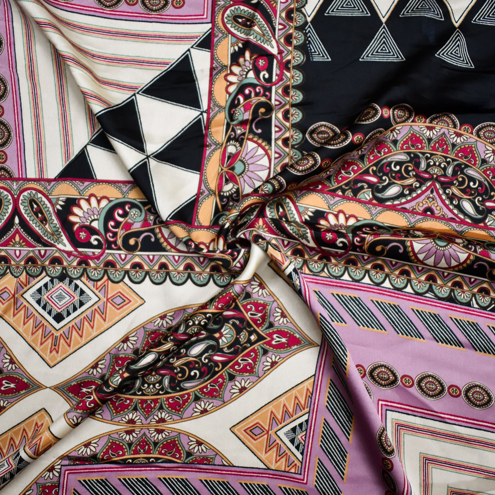 Purple-Beige-Multi Polyester Multi Pattern Border Printed Charmeuse Woven Fabric