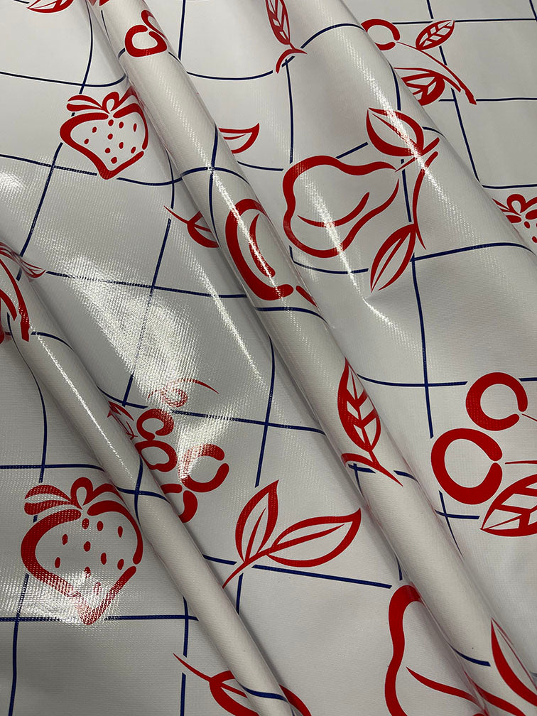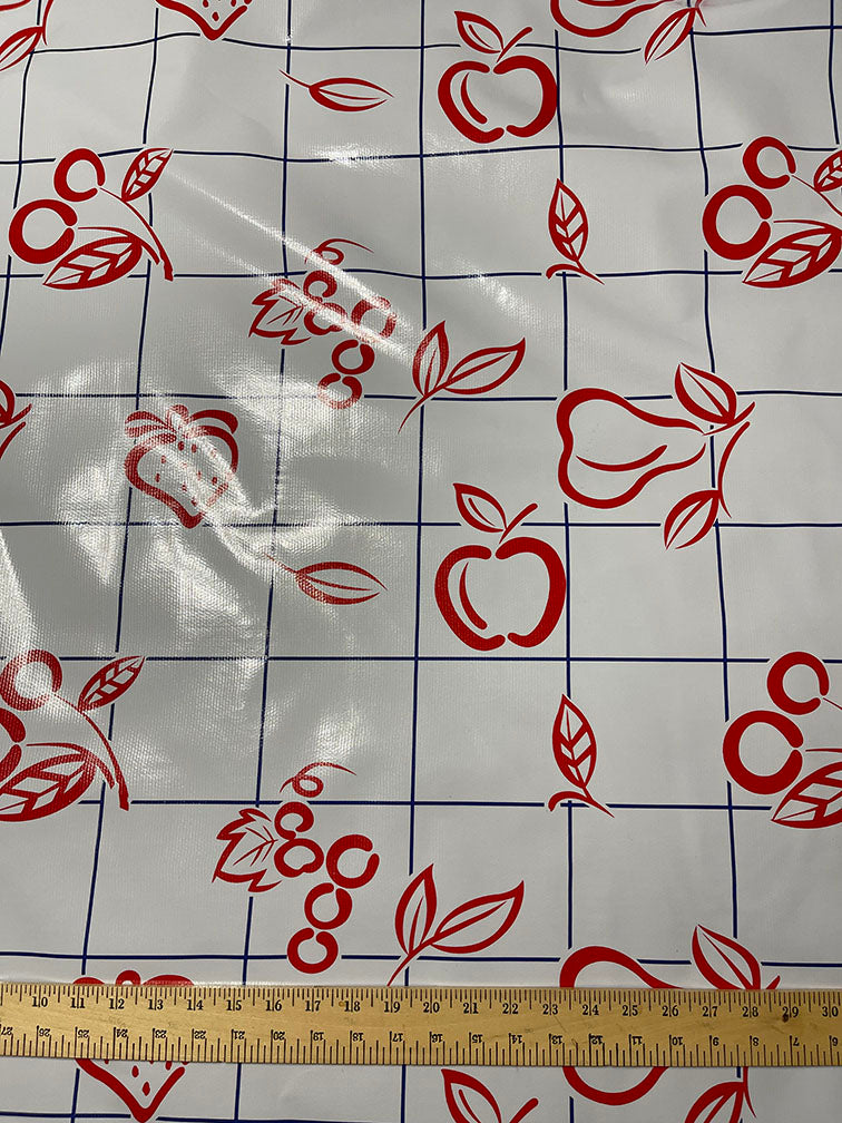 Red Fruit Print with Navy Blue Check Print on White Oilcloth Fabric