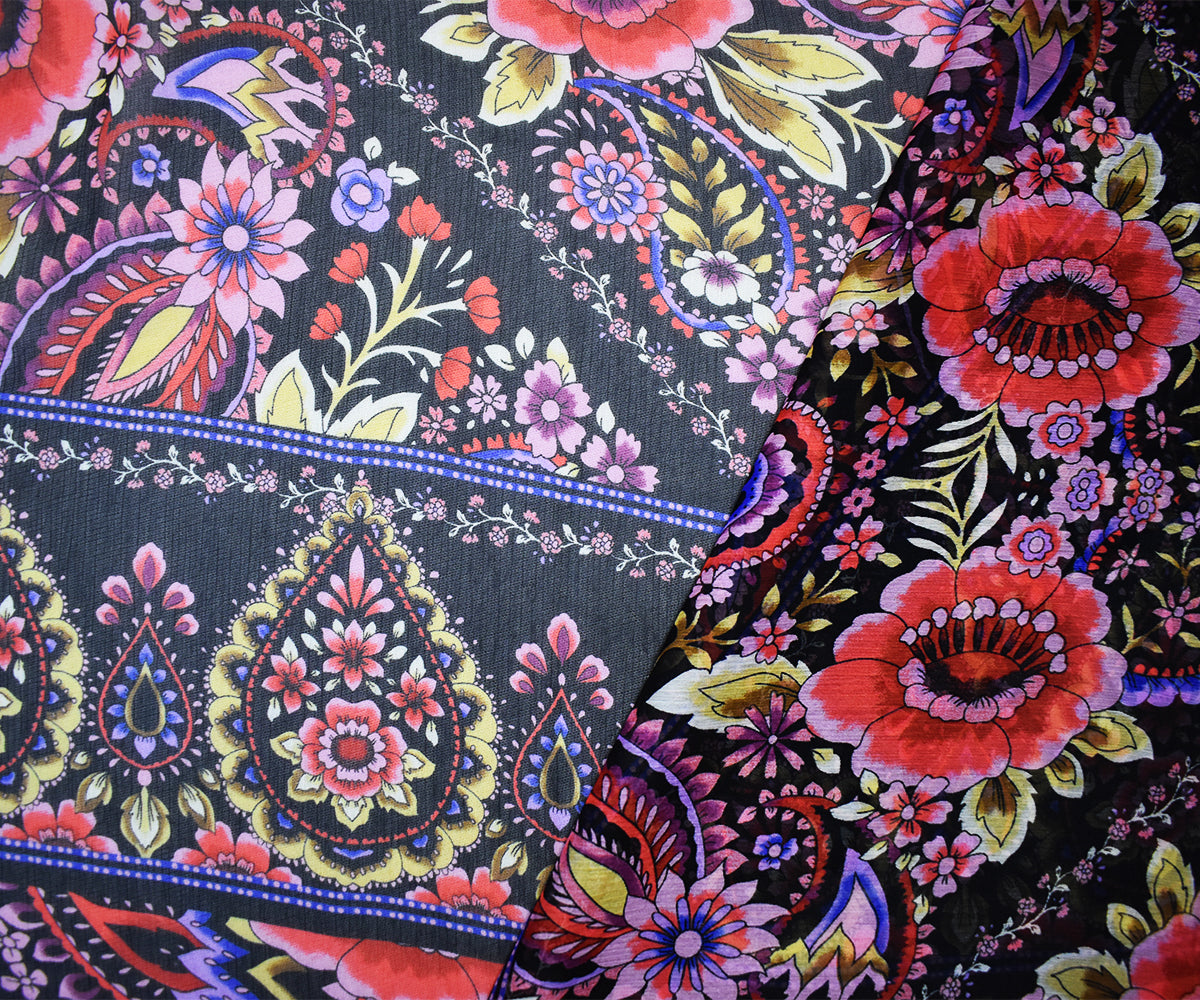 Black-Pink-Multi Poly Floral Printed Crinkle Yoryu Chiffon Woven Fabric