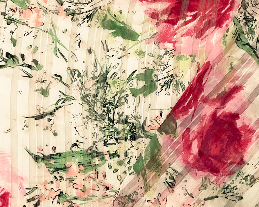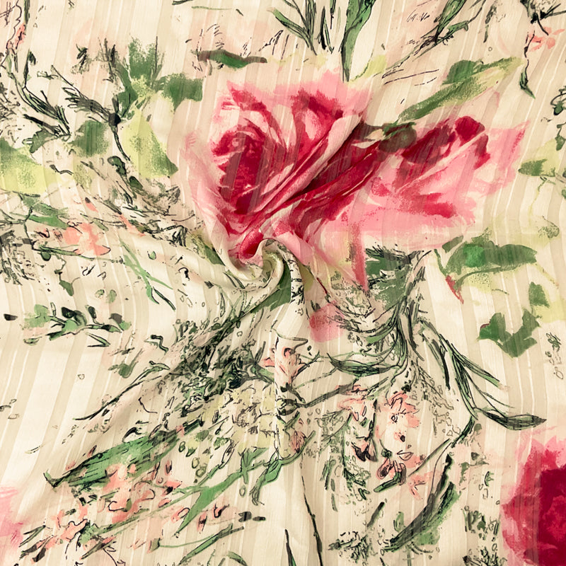 White-Multi Poly Floral Print Stripe Satin Chiffon Woven Fabric