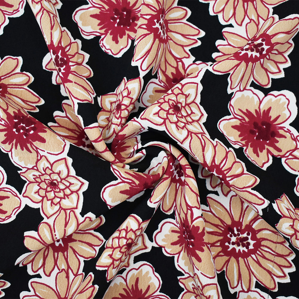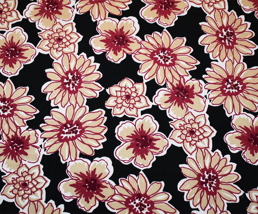 Black-Red-Beige Floral Printed Rayon Crepe Faille Woven Fabric