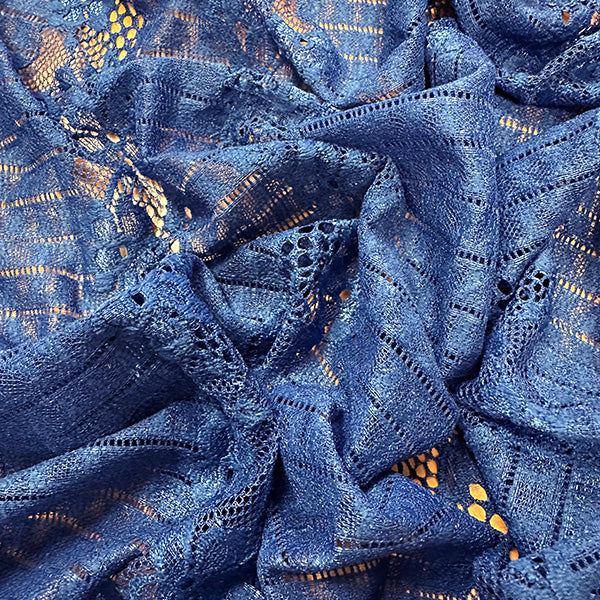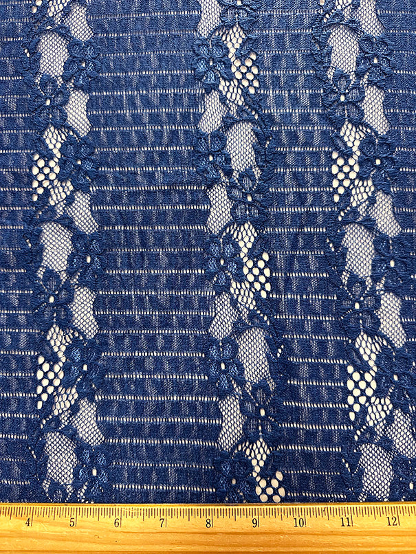 -Solid Blue Embroidered Floral Stripe Lace Fabric w/ Double Scalloped Border
