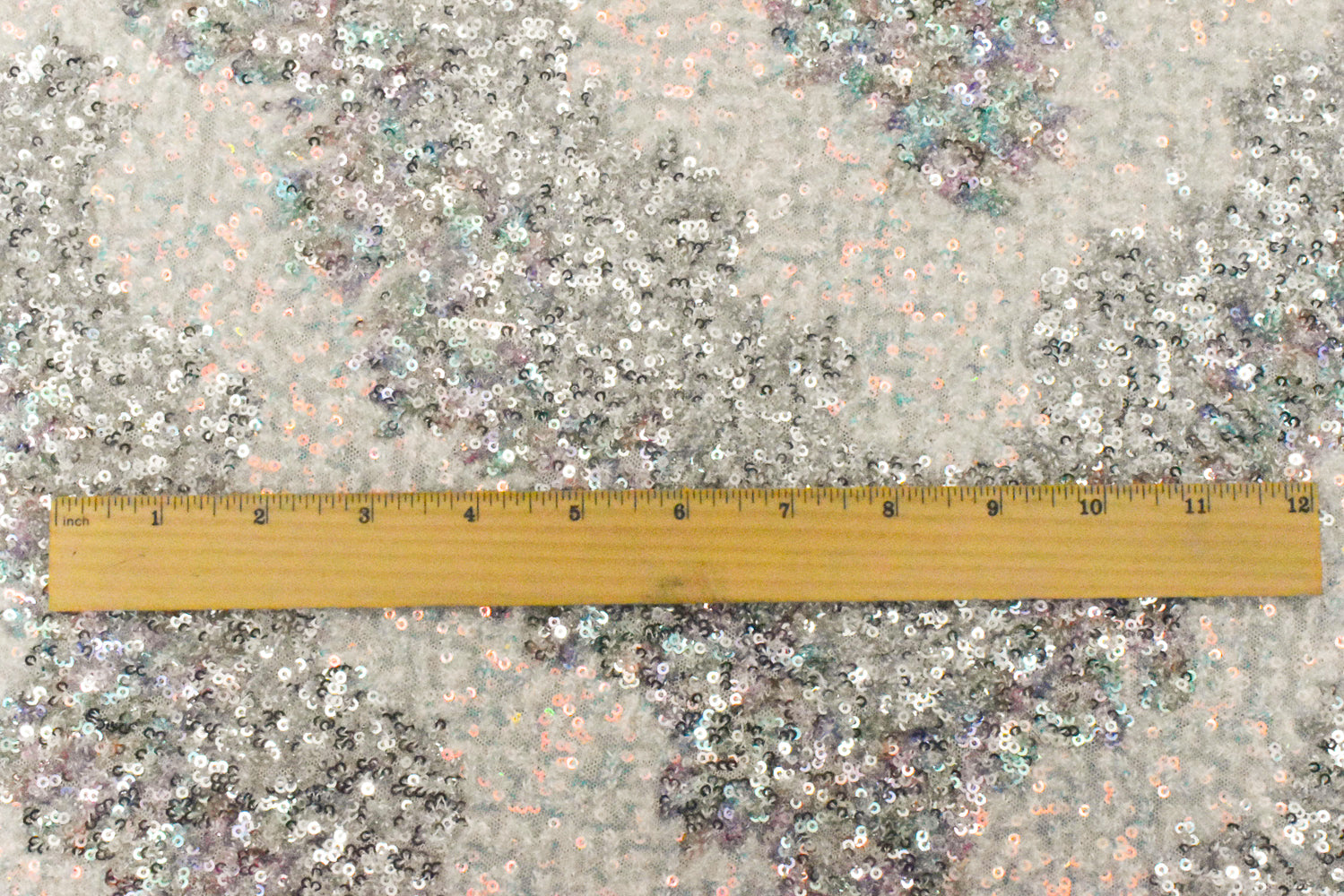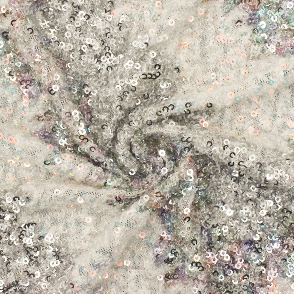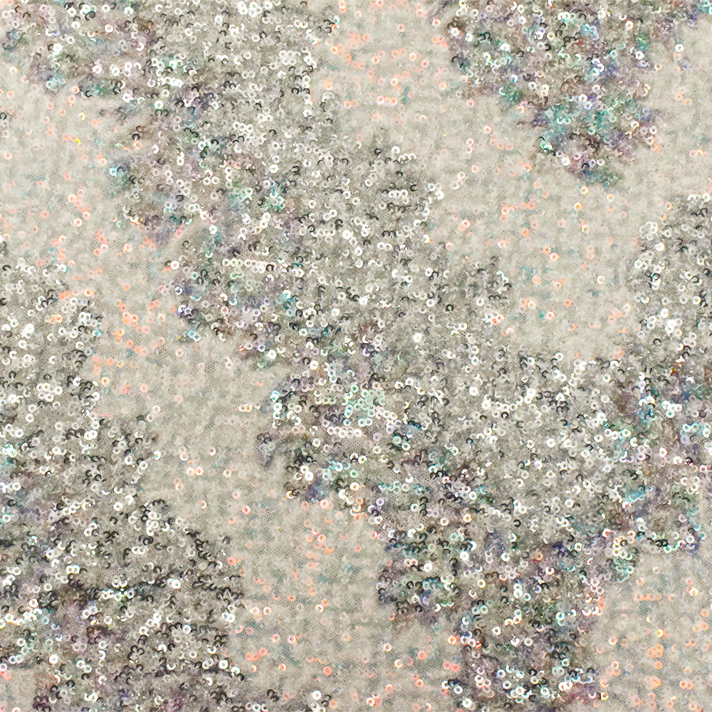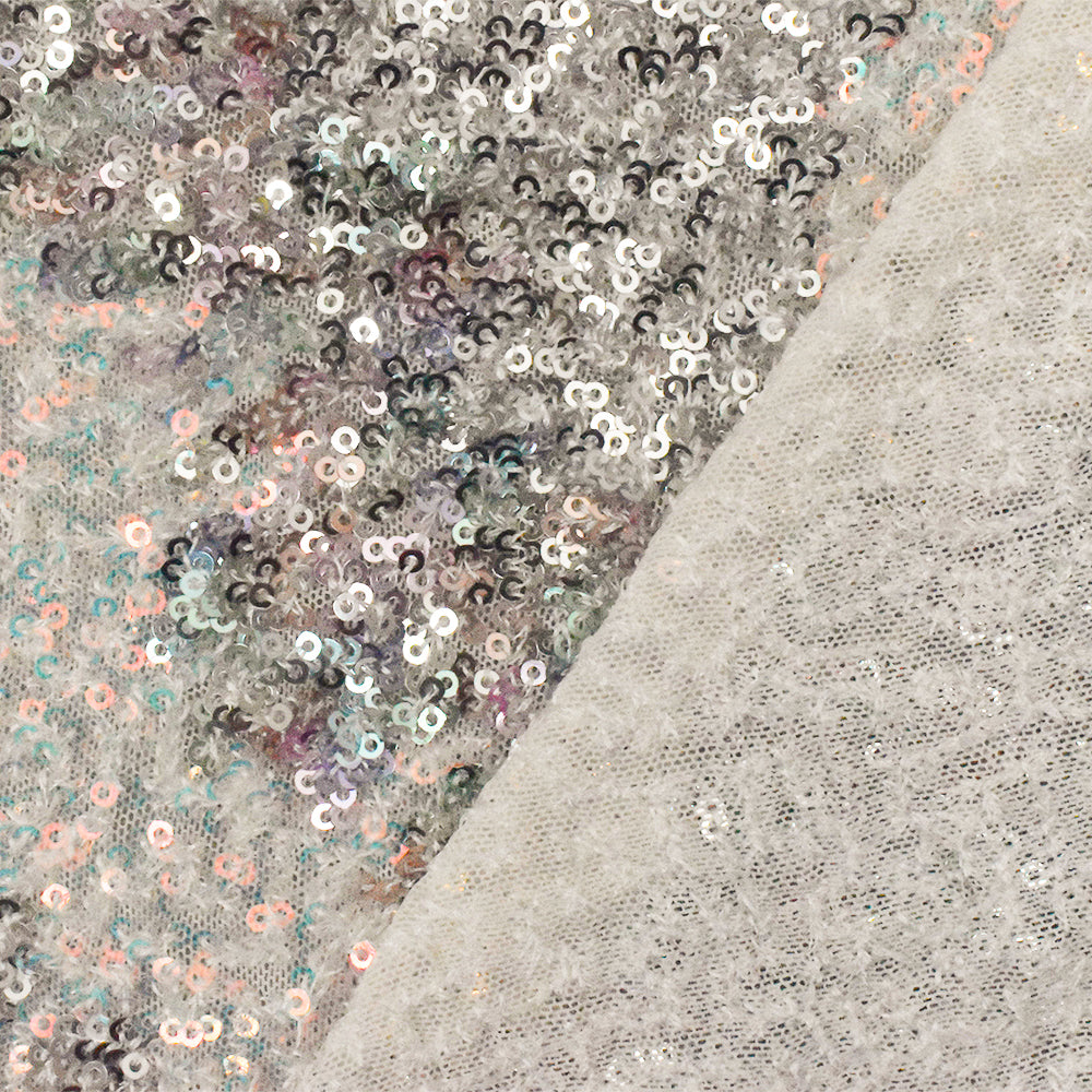 Silver-Iridescent-Multi Stylized Chevron Sequin Poly Mesh Knit Fabric
