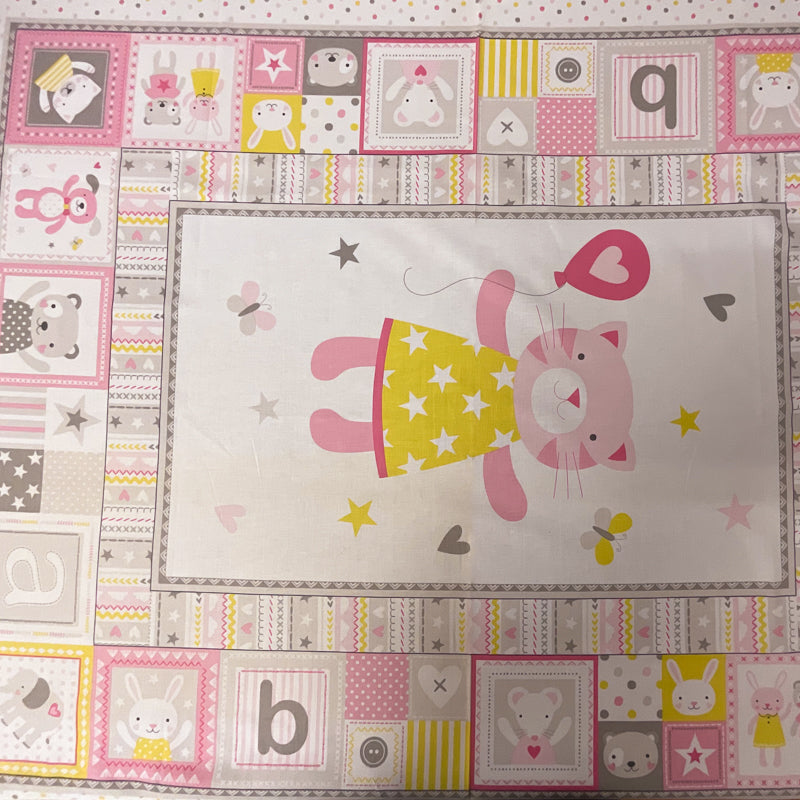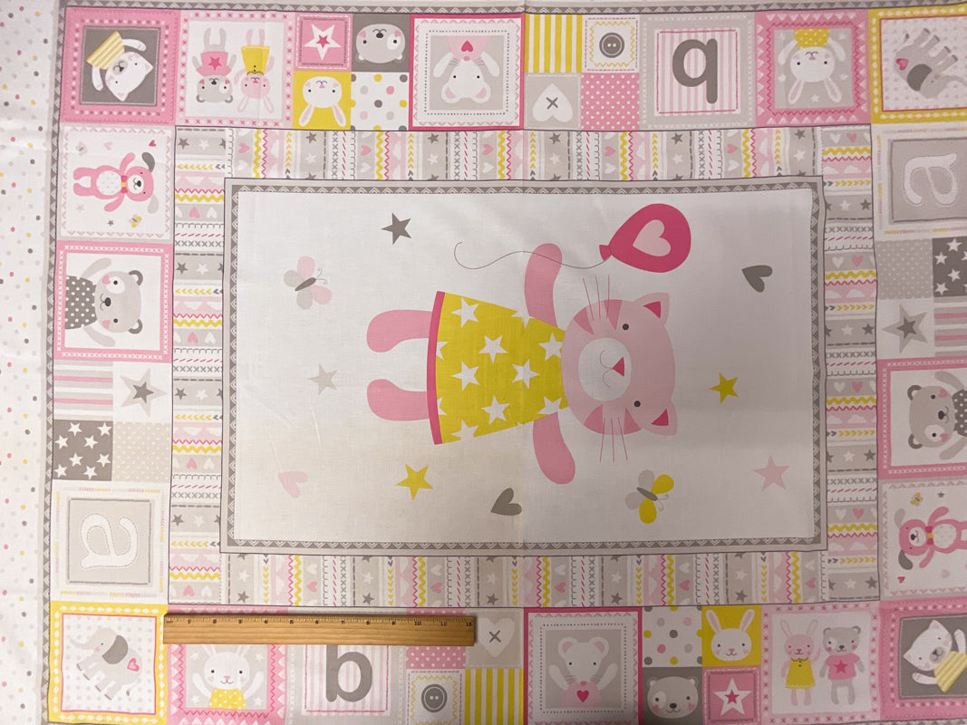 1 YD PC- PANEL Pink-Gray Cuddly Cat 100% Cotton Remnant Fabric
