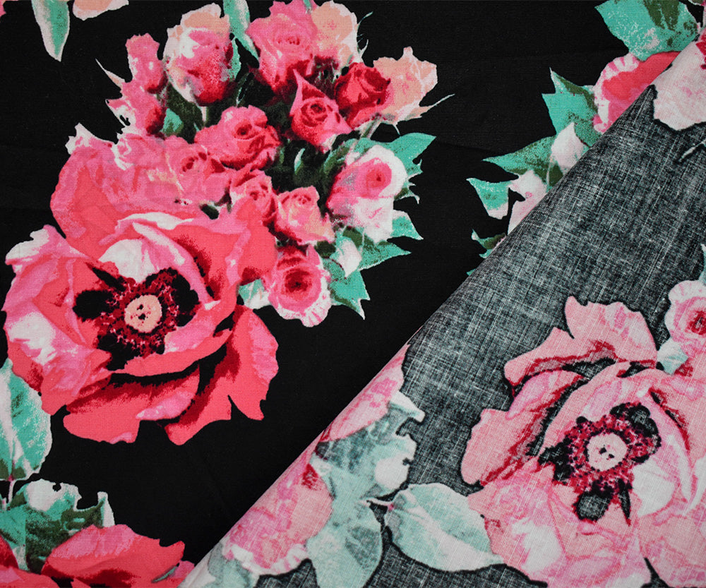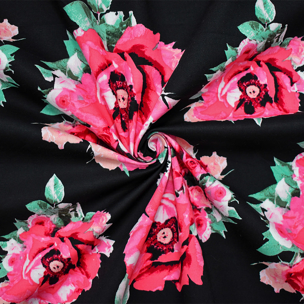 Black-Green-Pink Cotton Floral Print Stretch Spandex Poplin Woven Fabric