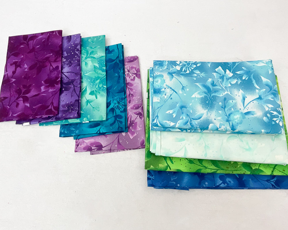 - Bundle fabrics include: 3/4 yard royal blue tonal, 1/4 yard red purple tonal, 1/4 yard purple tonal, 1/4 yard lilac tonal, 1/4 yd dark turquoise tonal, 1/4 yard green blue tonal, 5/8 yard yellow green tonal, 1 yard green tonal, 1 1/4 yard aqua tonal, 1 3/8 yard sky blue tonal. Pattern is not included.