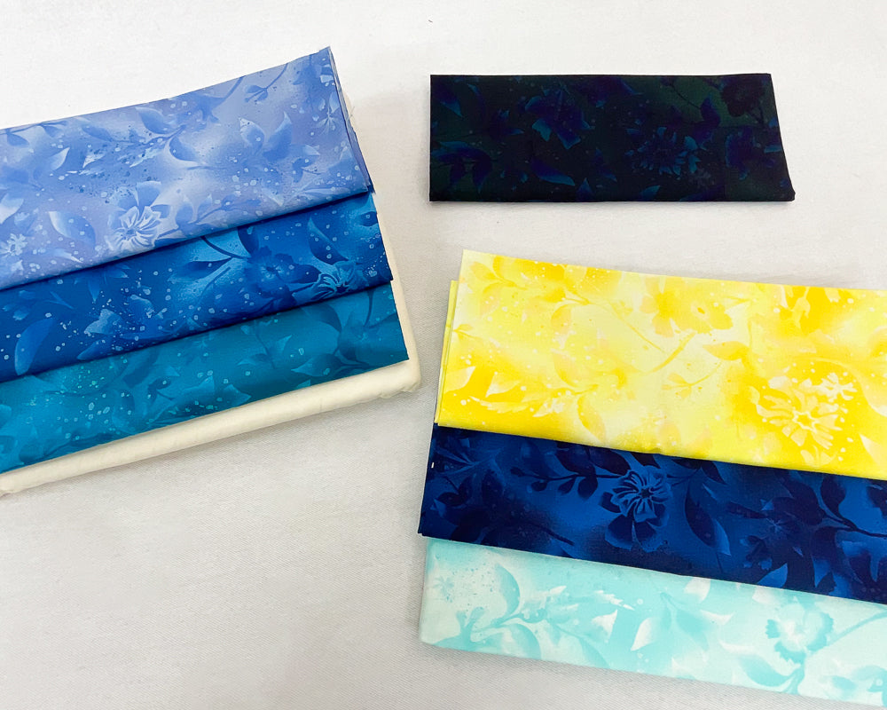 - Bundle fabrics include: 5/8 yard dark blue on blue tonal floral, 5/8 yard yellow tonal floral, 3/8 yard moss purple tonal floral, 3/4 yard royal blue tonal floral, 7/8 yard teal tonal floral, 1 yard chambray tonal floral, 1 3/4 yards white aqua floral, 8 yards ivory solid. Pattern is not included.