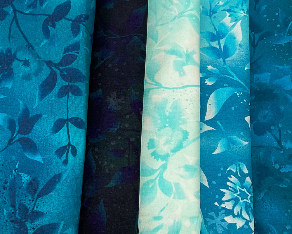 - Bundle fabrics include: 1 1/4 yds teal tonal floral, 1 1/4 yds aqua teal tonal floral, 1 3/4 yds aqua ivory tonal floral, 1 3/4 yds navy green tonal floral, 3 5/8 yds teal blue tonal floral. Pattern is not included