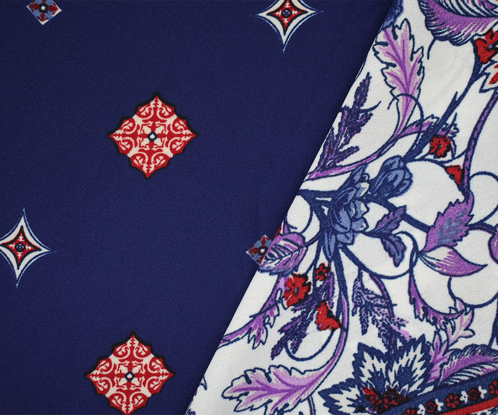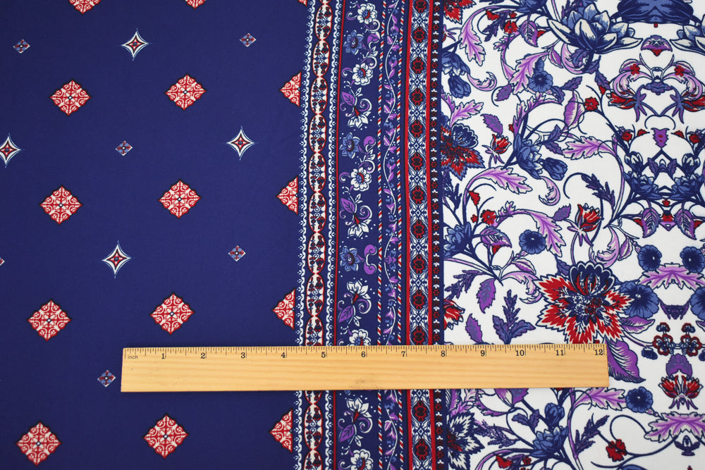 -100% polyester crepe momie georgette woven fabric printed with a bandana style bordered pattern on the selvedge. Featuring florals, and bandana design elements.