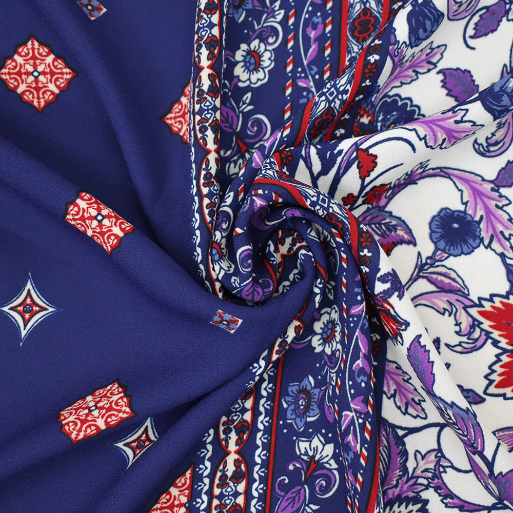 Blue-Red-Multi Floral Border Printed Poly Crepe Momie Georgette Fabric