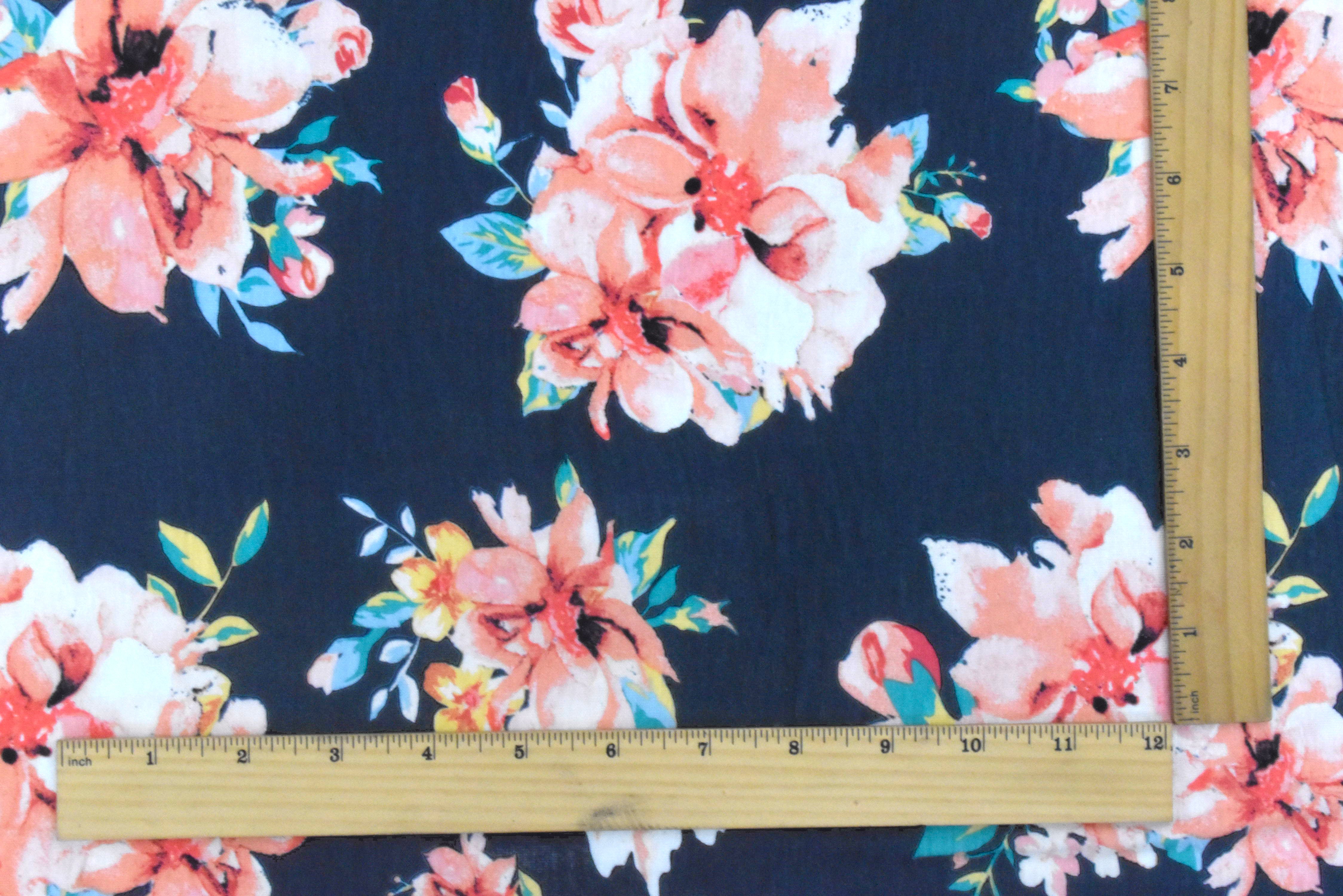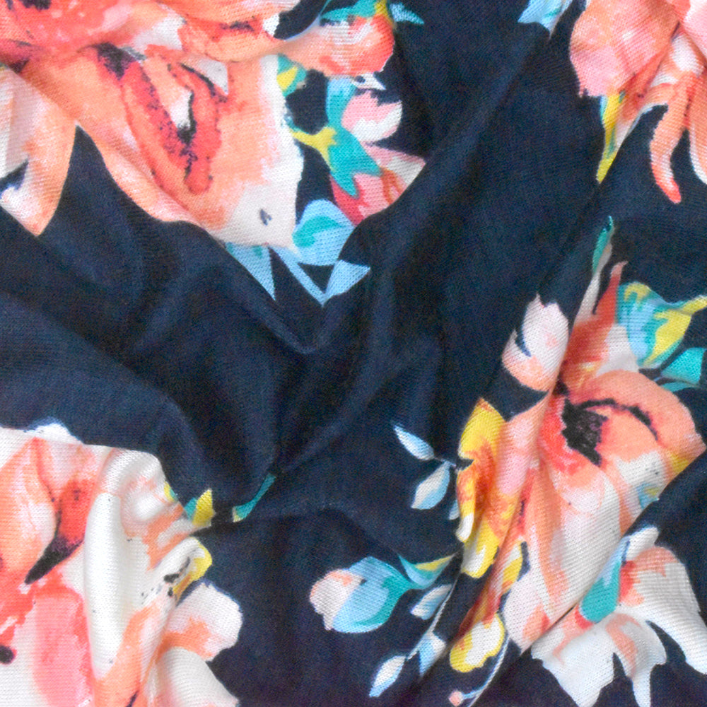 Navy-Multi Floral Printed Rayon Stretch Jersey Knit Fabric