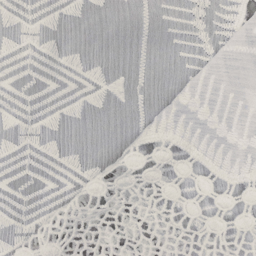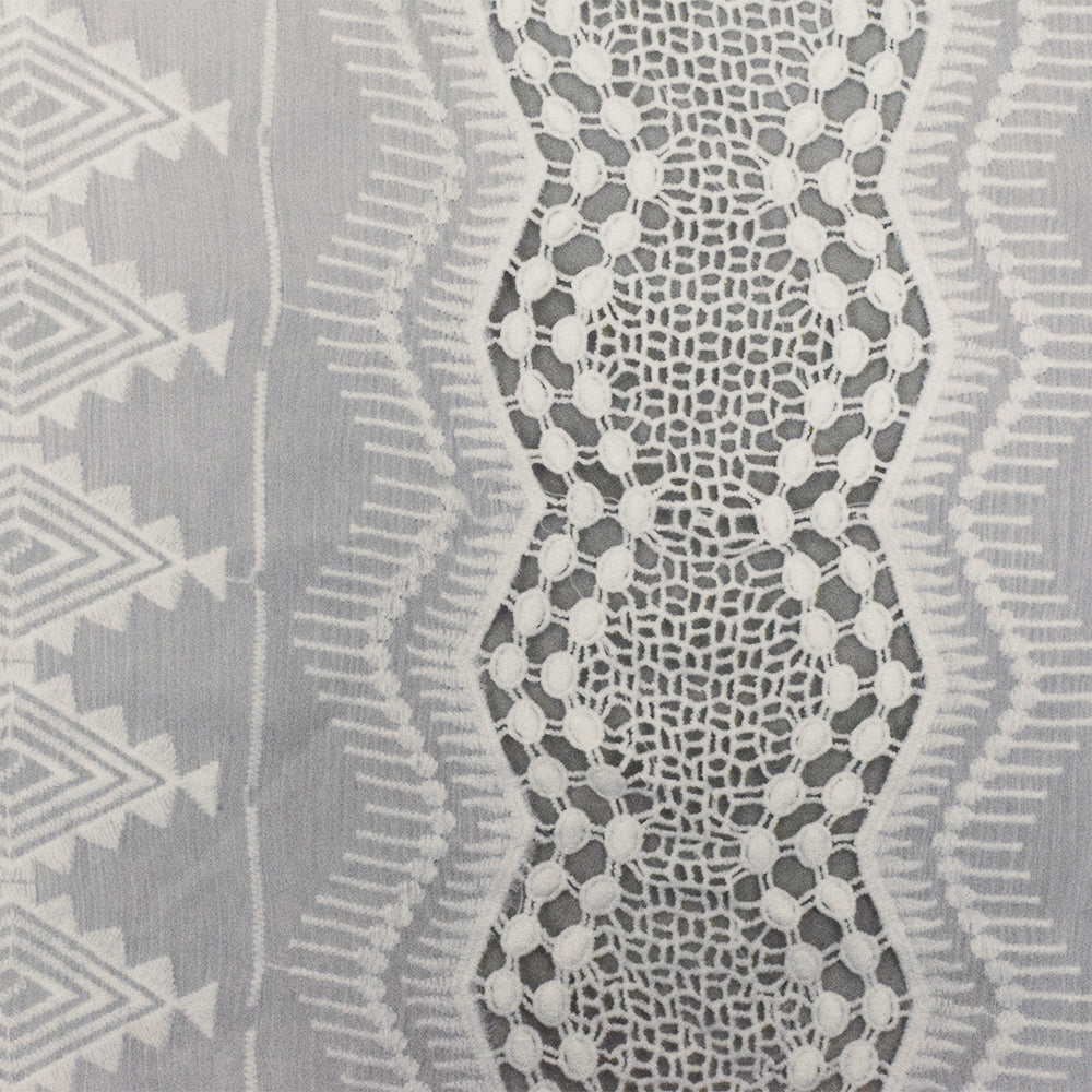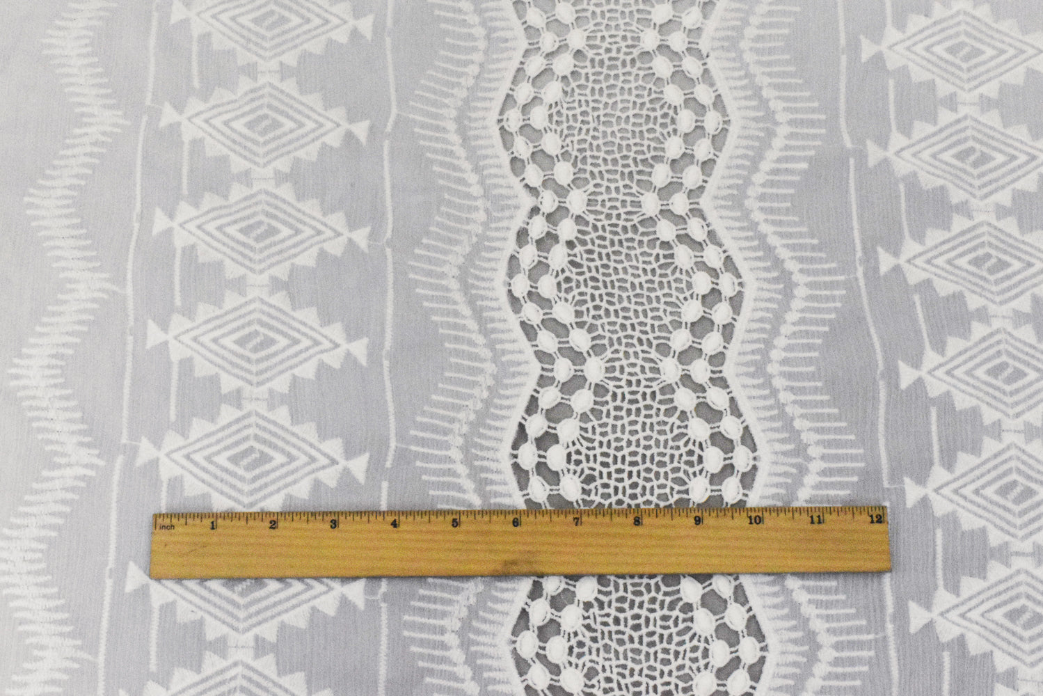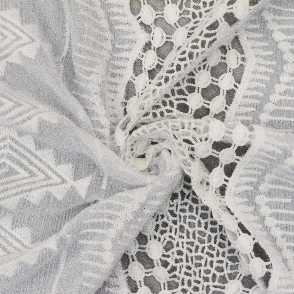 3 YD PC -100% cotton Aztec embroidery pattern with a chevron crochet lace detail on a 100% polyester yoryu chiffon woven fabric