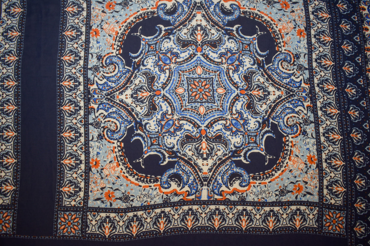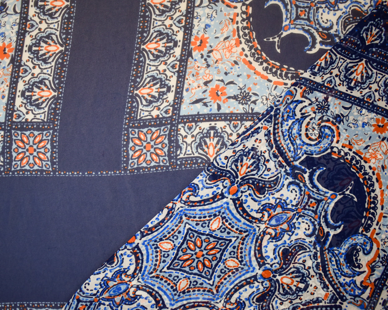 4 YD PC -Blue-White-Orange Poly Moroccan Bandana PANEL Printed Chiffon Woven Fabric