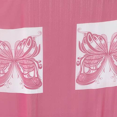Deep pink and white printed polyester chiffon.  Each PANEL is 58" Wide and 33" Long, and has 2 squares with a butterfly in each box.  Each box has a 9 1/2" separation, and has silver vertical streaking throughout.  -Weight: Tissue weight  -Transparency: Sheer  -Hand: Dry  -Stretch: No Stretch  -Drape: Good  -Luster: Matte  -End Uses: blouses, dresses, skirts, overlays and more.  Compare to $12.00/yd 100% Polyester