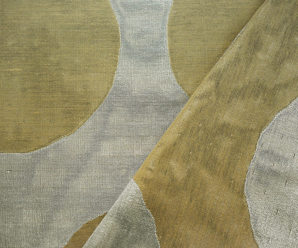 Lightweight, sheer drapery fabric uses beige and silver. It arranges large dots in a half drop layout and is constructed with a double weave, making a two-sided fabric in which the back is an inverted color way of the front.