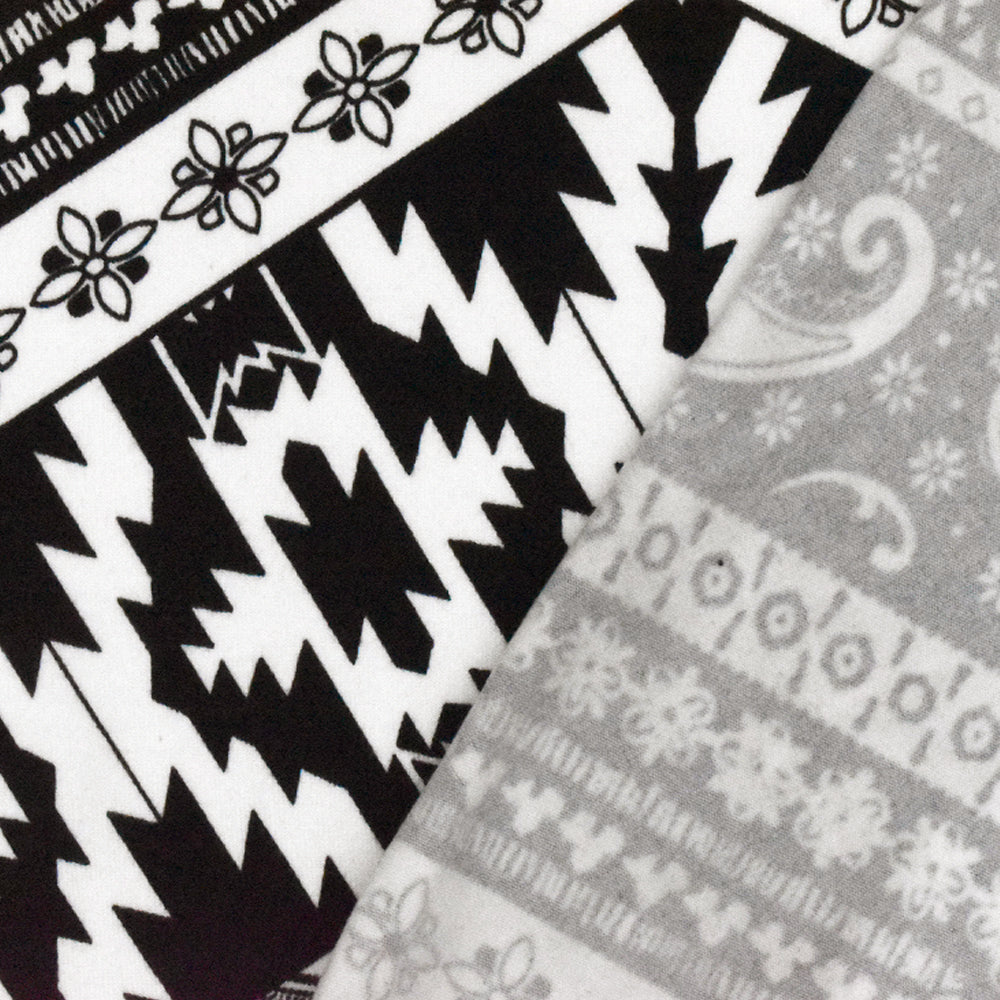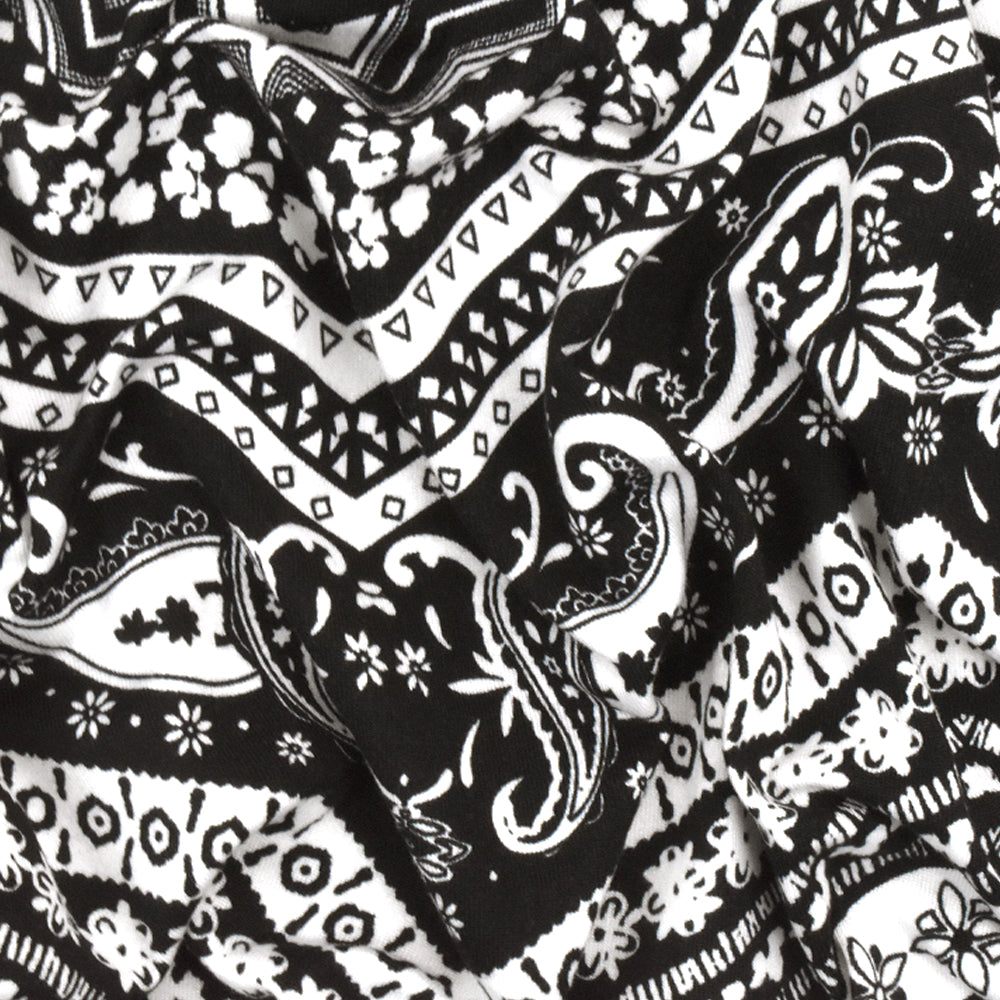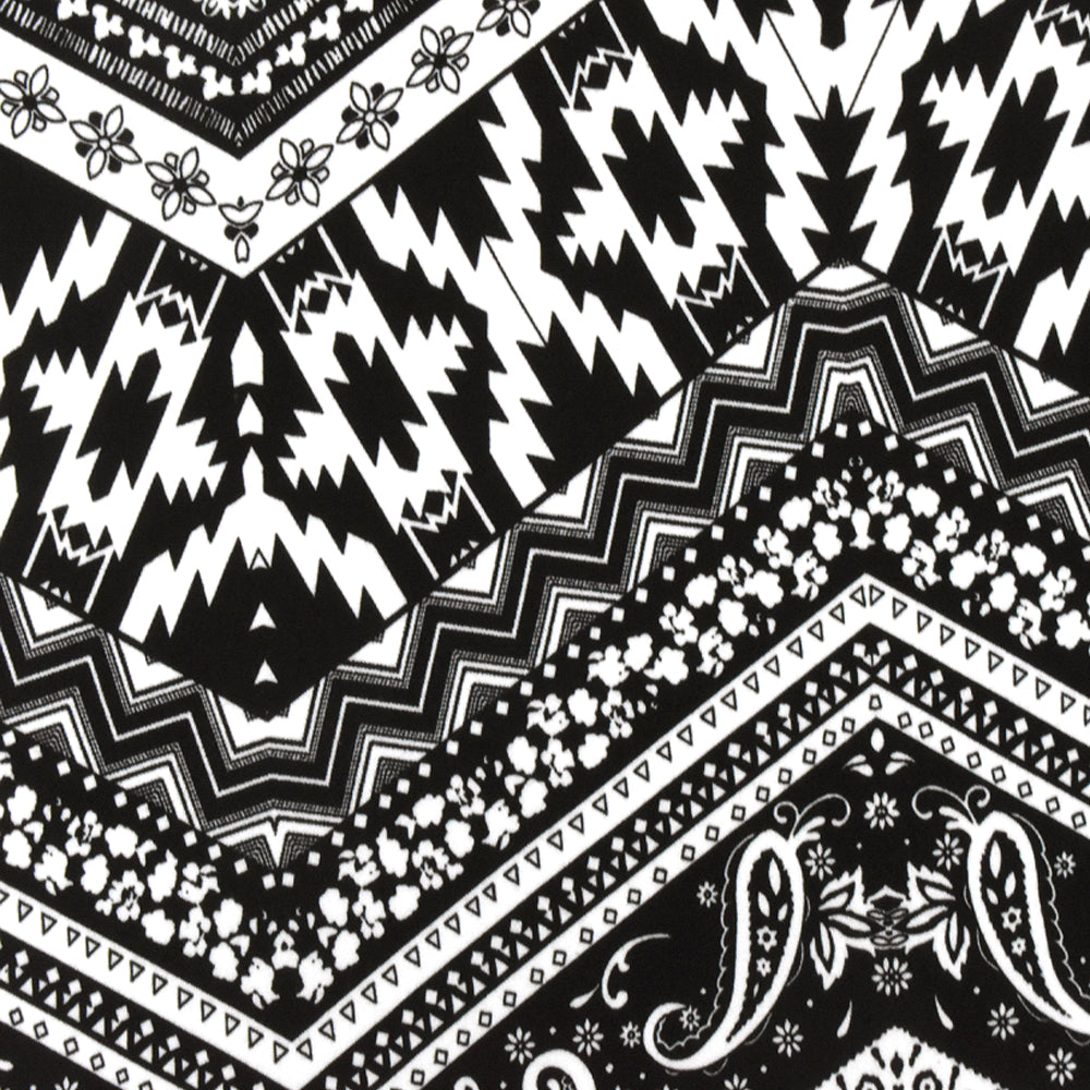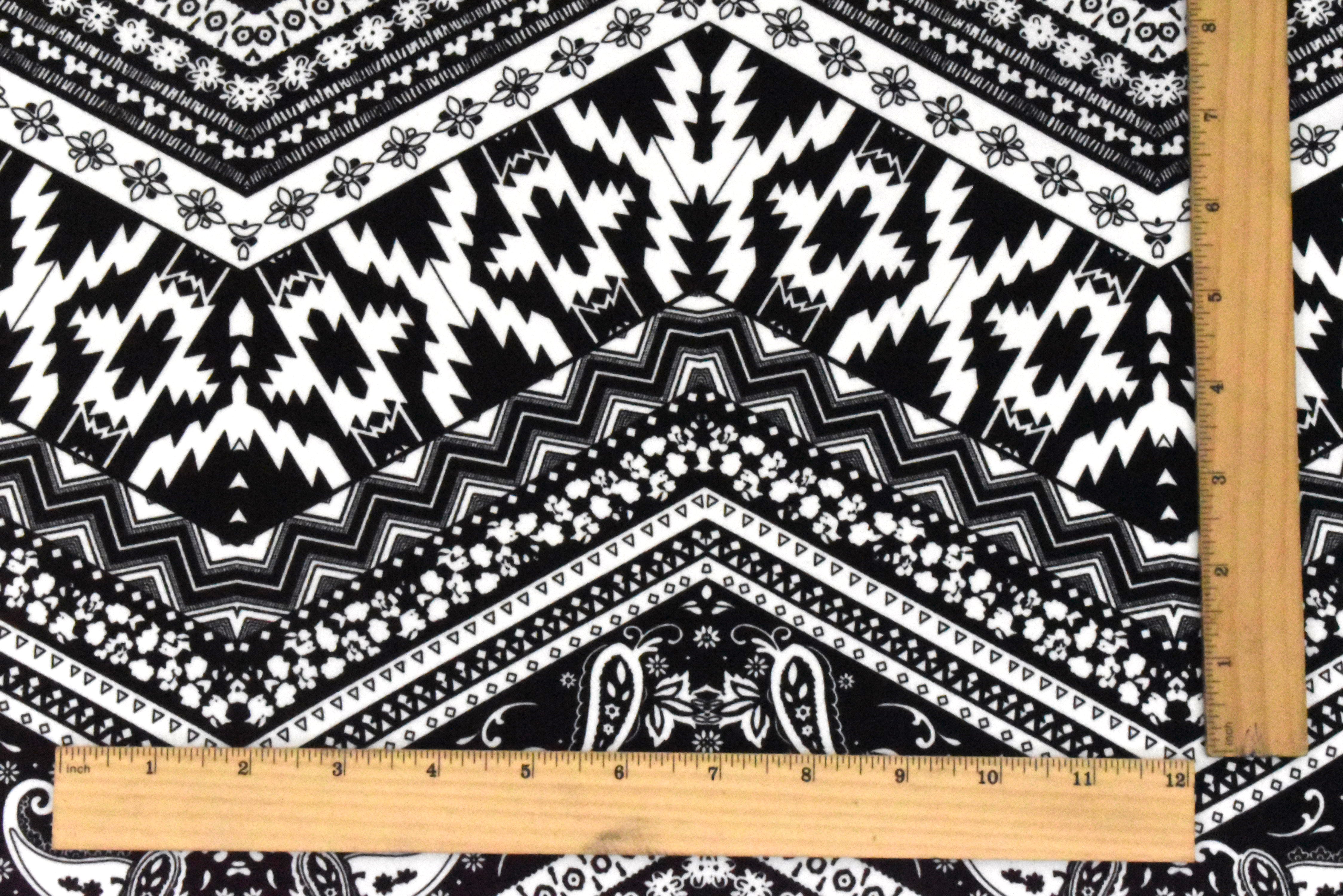 -Chevron with floral, paisley, and Aztec elements printed stretch polyester double brushed ITY knit fabric