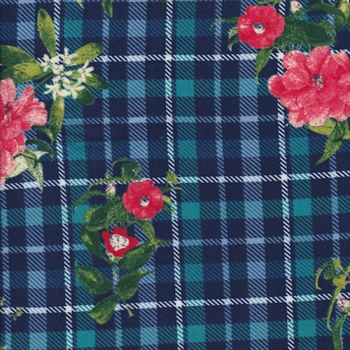 Blue/Teal Plaid Floral Double Brushed Jersey Knit Fabric