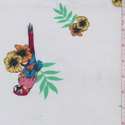 White Multi Parrot Floral Double Brushed Jersey Knit Fabric