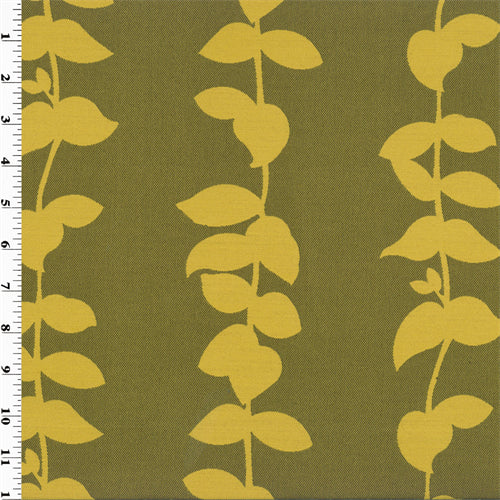 Woven jacquard in yellow and dark brown features leaf vines positioned to create vertical stripe. It has incredibly soft hand and drape ability making it ideal for upholstery, pillows, bedding, and drapery. Either sides of fabric may be used.