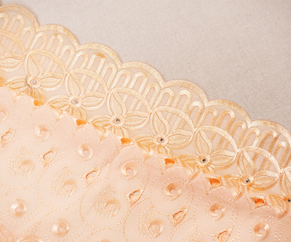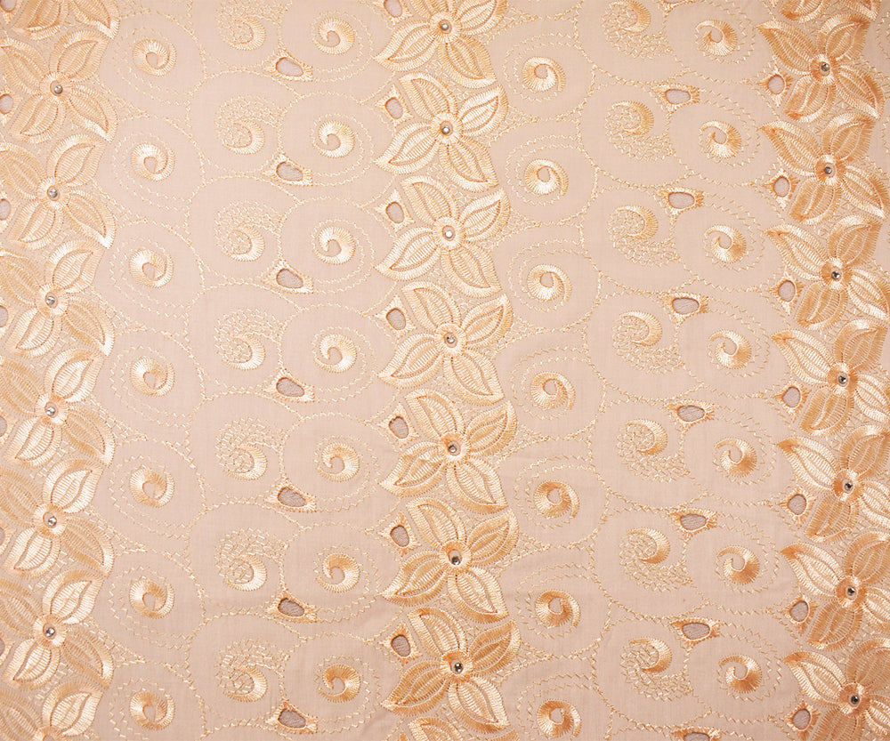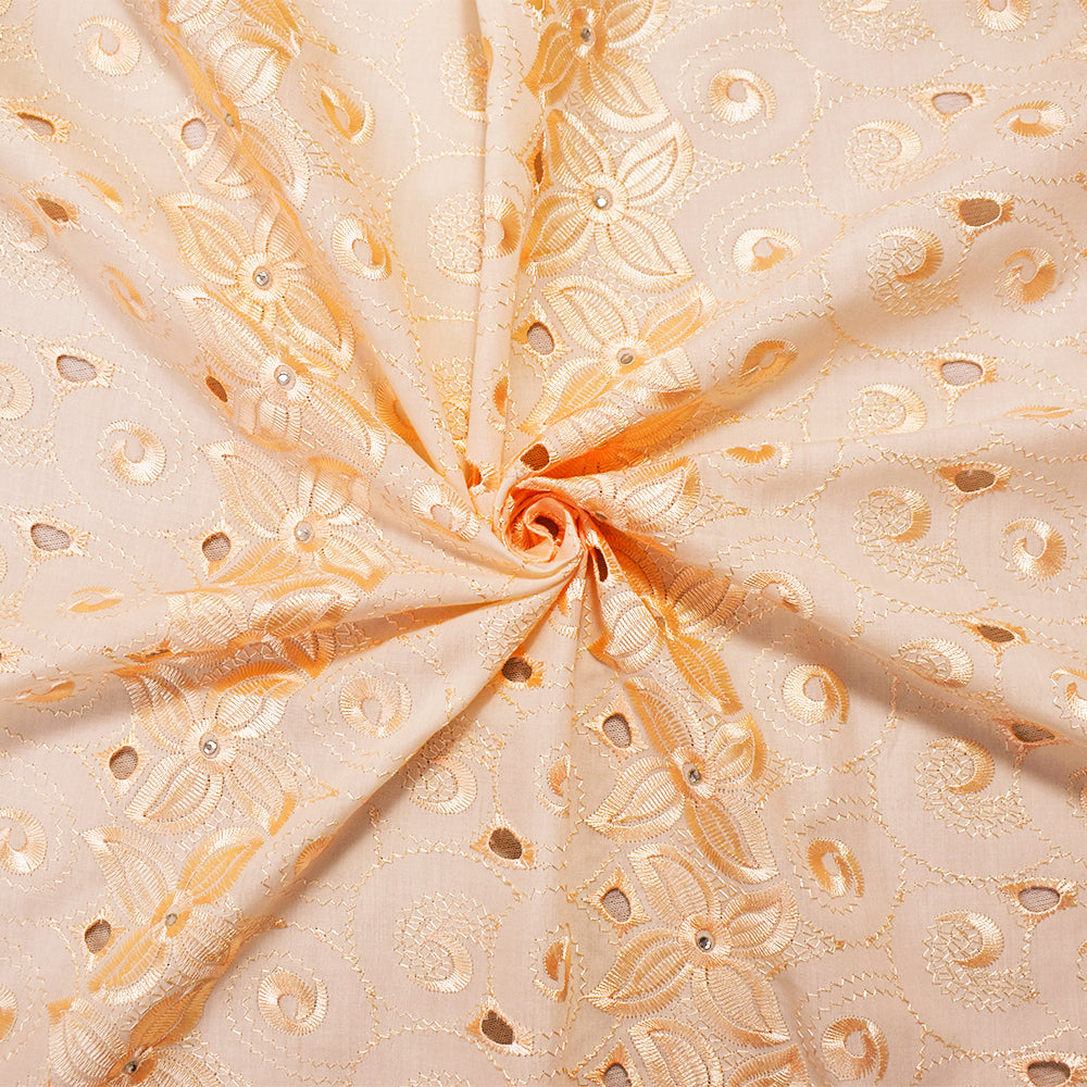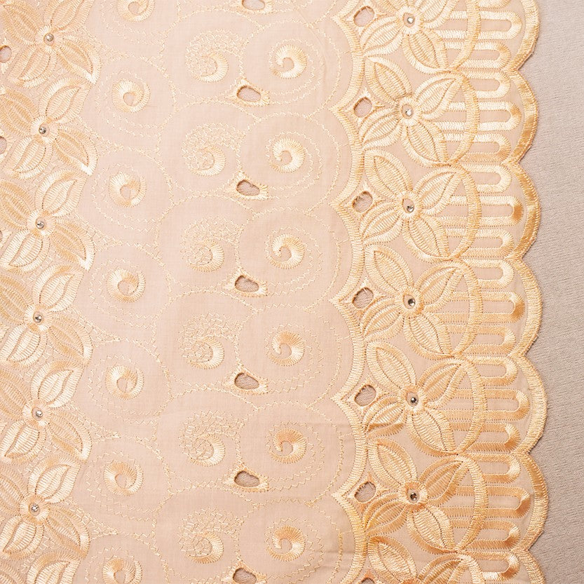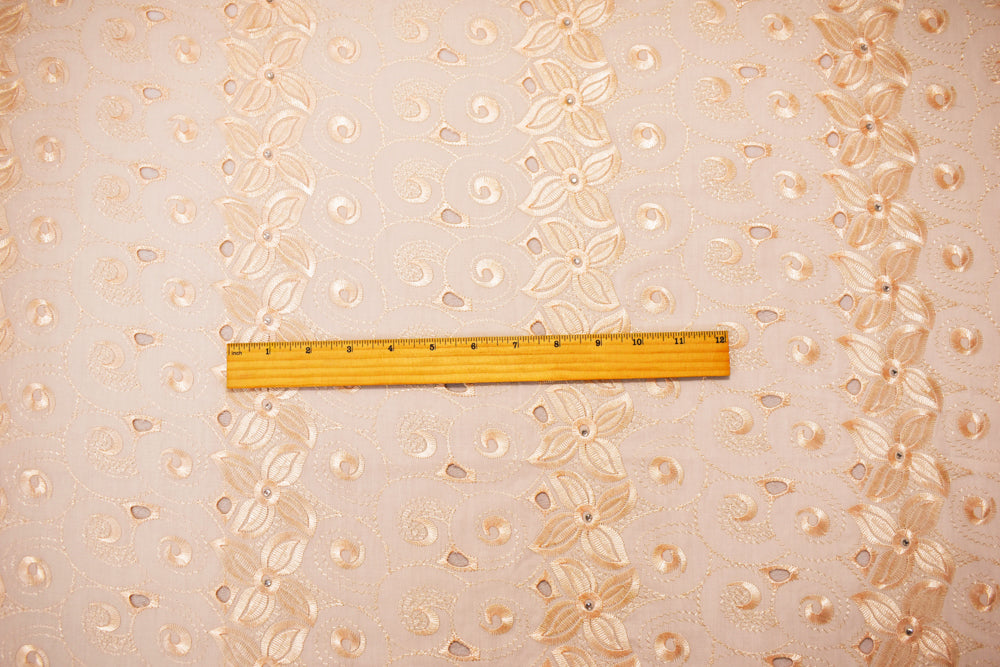 Beige Poly-Cotton Embroidered Floral Scallop Rhinestone Woven Fabric