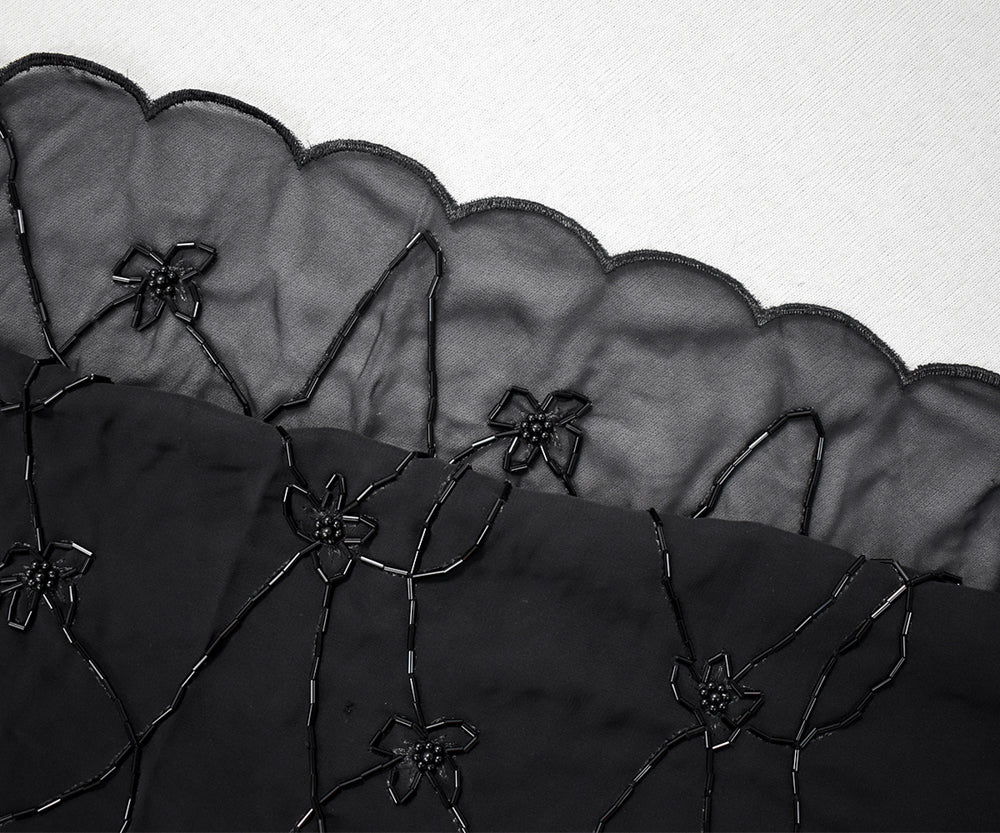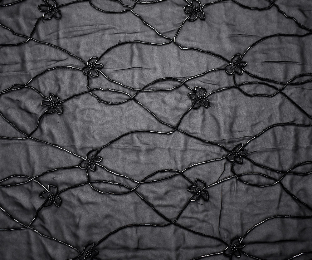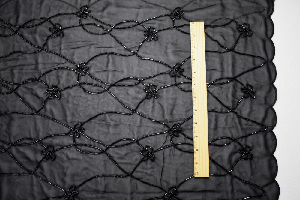 Black Polyester Beaded Floral Vine Embroidered Scallop Chiffon Woven Fabric