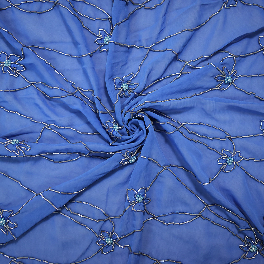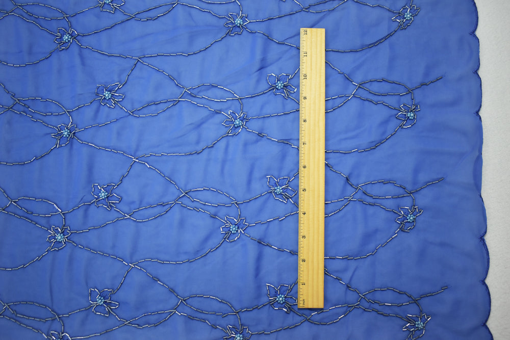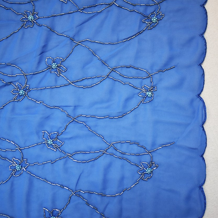 Blue Polyester Beaded Floral Vine Embroidered Scallop Chiffon Woven Fabric