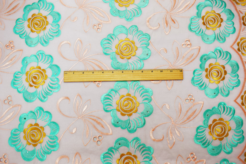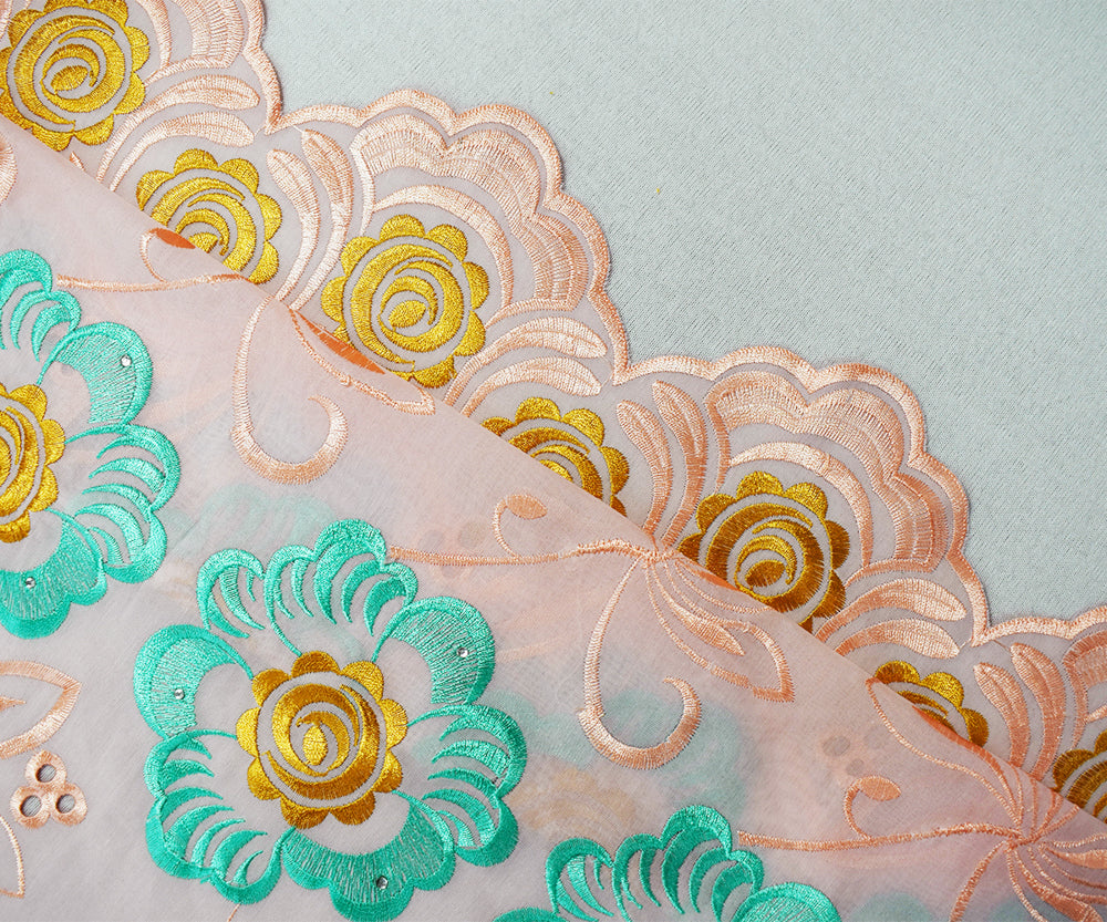 Coral Orange-Multi Poly Embroidered Floral Scallop Rhinestone Woven Fabric