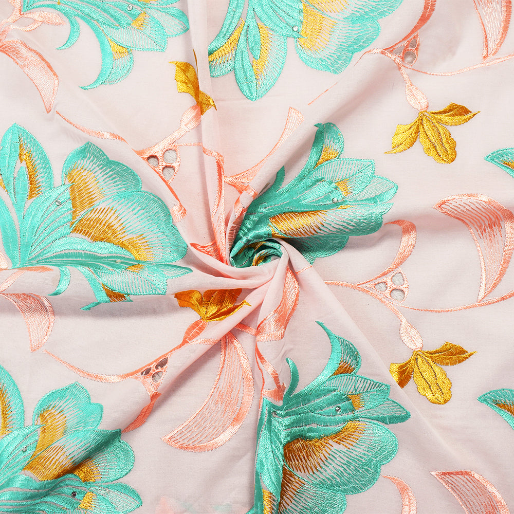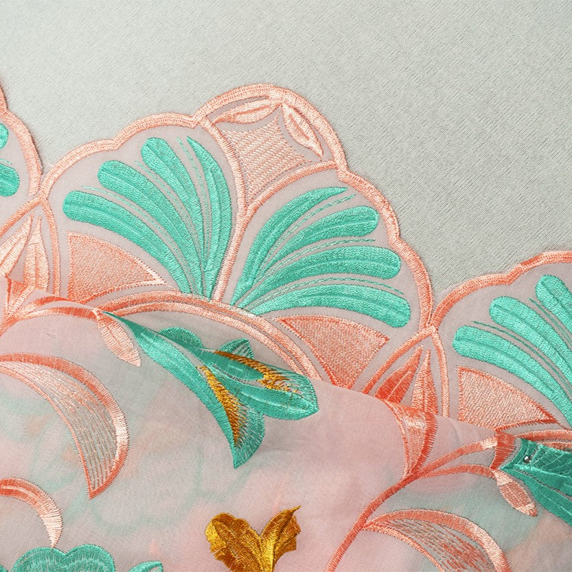 Coral Orange-Teal-Multi Poly-Cotton Floral Vine Embroidery Scallop Woven Fabric