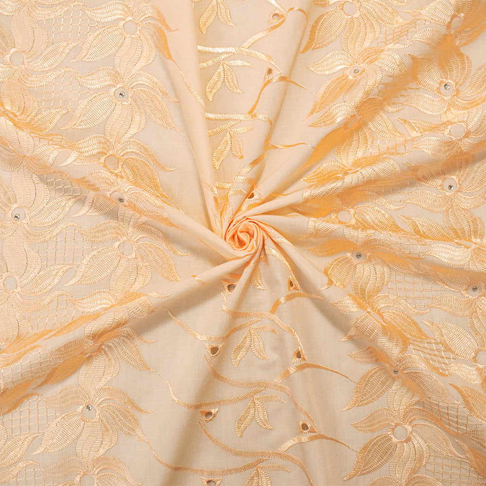 Light Beige Poly-Cotton Embroidered Floral Scallop Rhinestone Woven Fabric