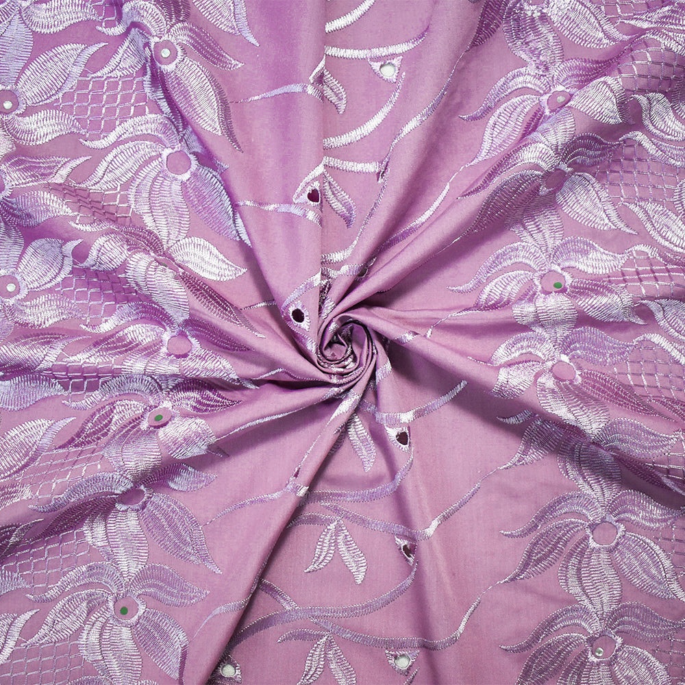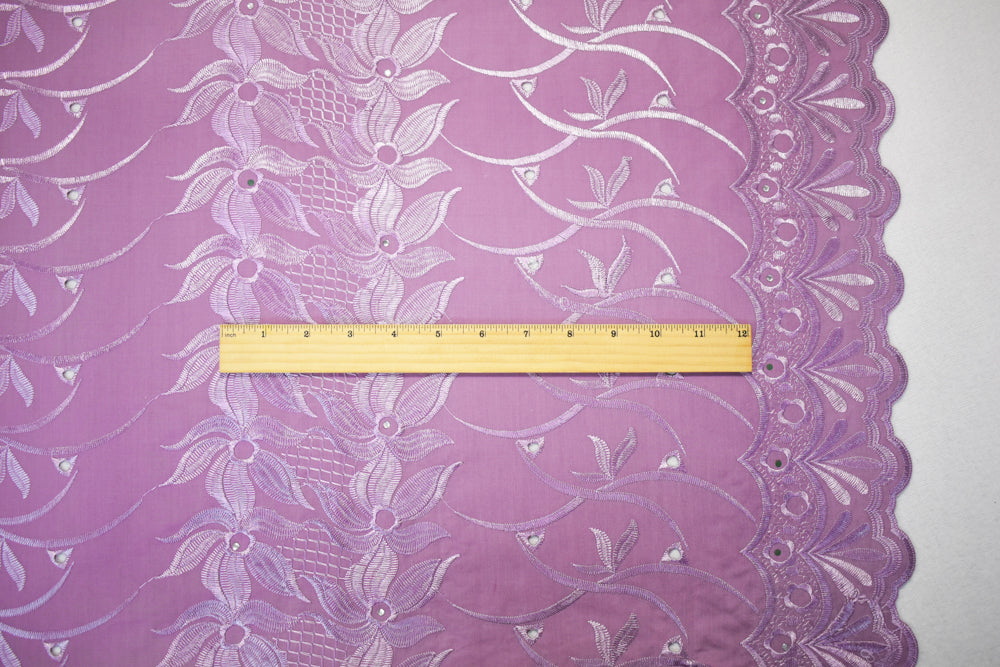 Mauve Purple Poly-Cotton Embroidered Floral Scallop Rhinestone Woven Fabric