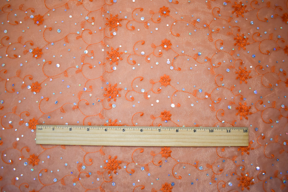 -Orange-Silver Poly Metallic Floral Embroidery Scallop Organza Woven Fabric
