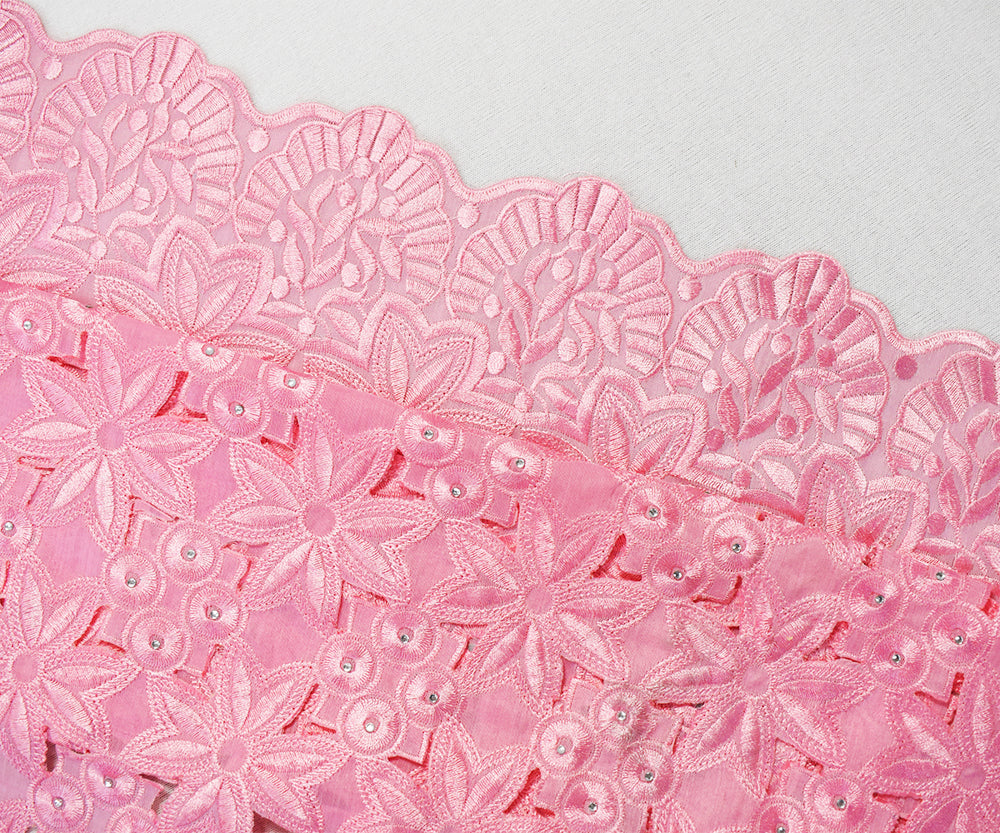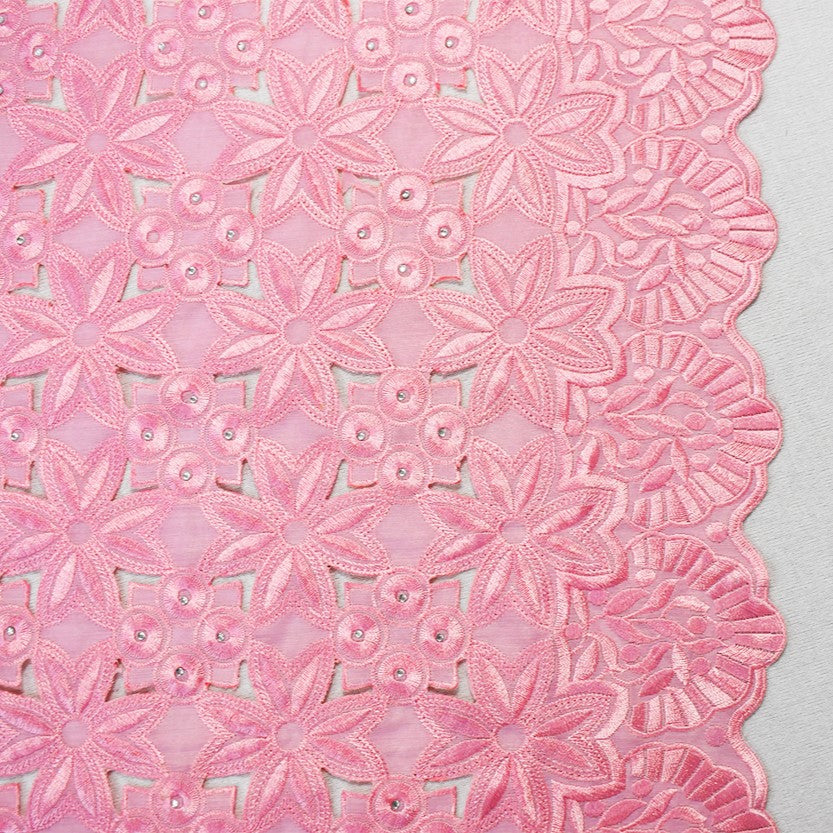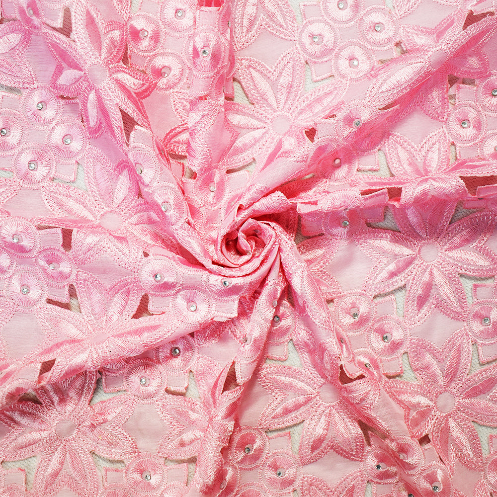 Pastel Pink Polyester Floral Circle Scalloped Rhinestone Woven Fabric