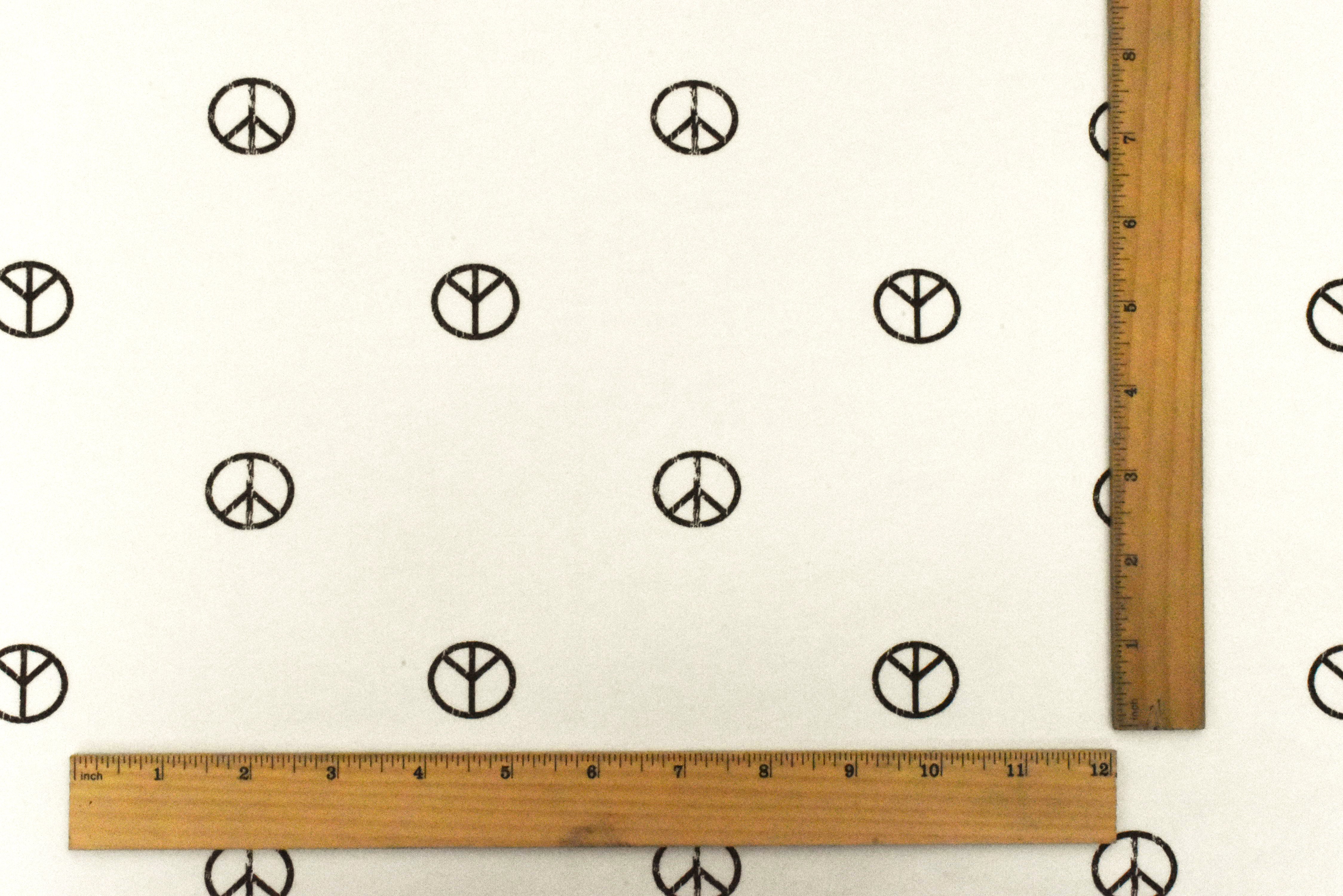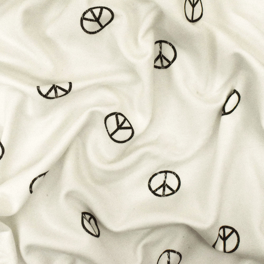 Ivory-Black Peace Printed Stretch Cotton French Terry Brush Fleece Fabric