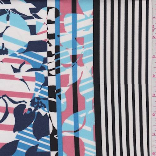 1 1/4 YD PC-Navy Multi Stripe/Floral Scuba Knit Fabric